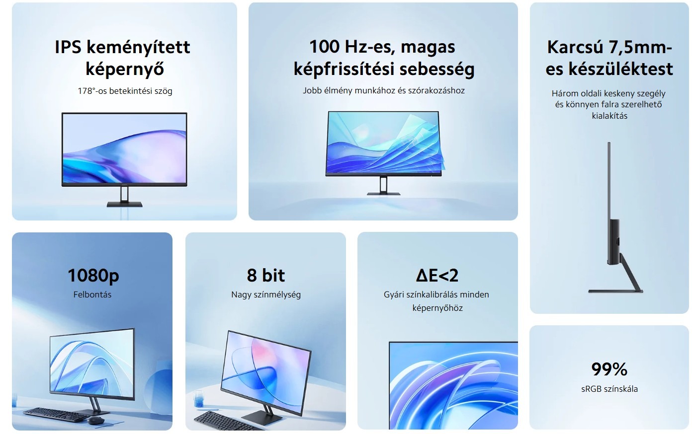 *99% sRGB, gyári kalibráció ΔE<2, 16,7M szín (6bit+FRC).