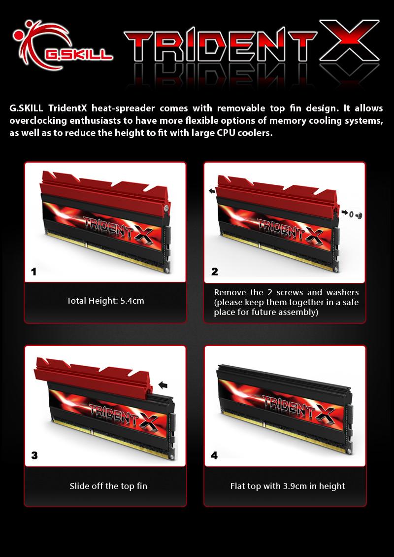 Extreme overclockers look no further. TridentX will push your system to the limit that was once unimaginable. Not only available at high frequencies of 2400MHz, 2600MHz, 2666MHz, 2800MHz, 2933MHz and 3000MHz, but also available with extremely low timings at 2133MHz CL9, 1866MHz CL8, and 1600MHz CL7 achieved with 8GB module capacity!