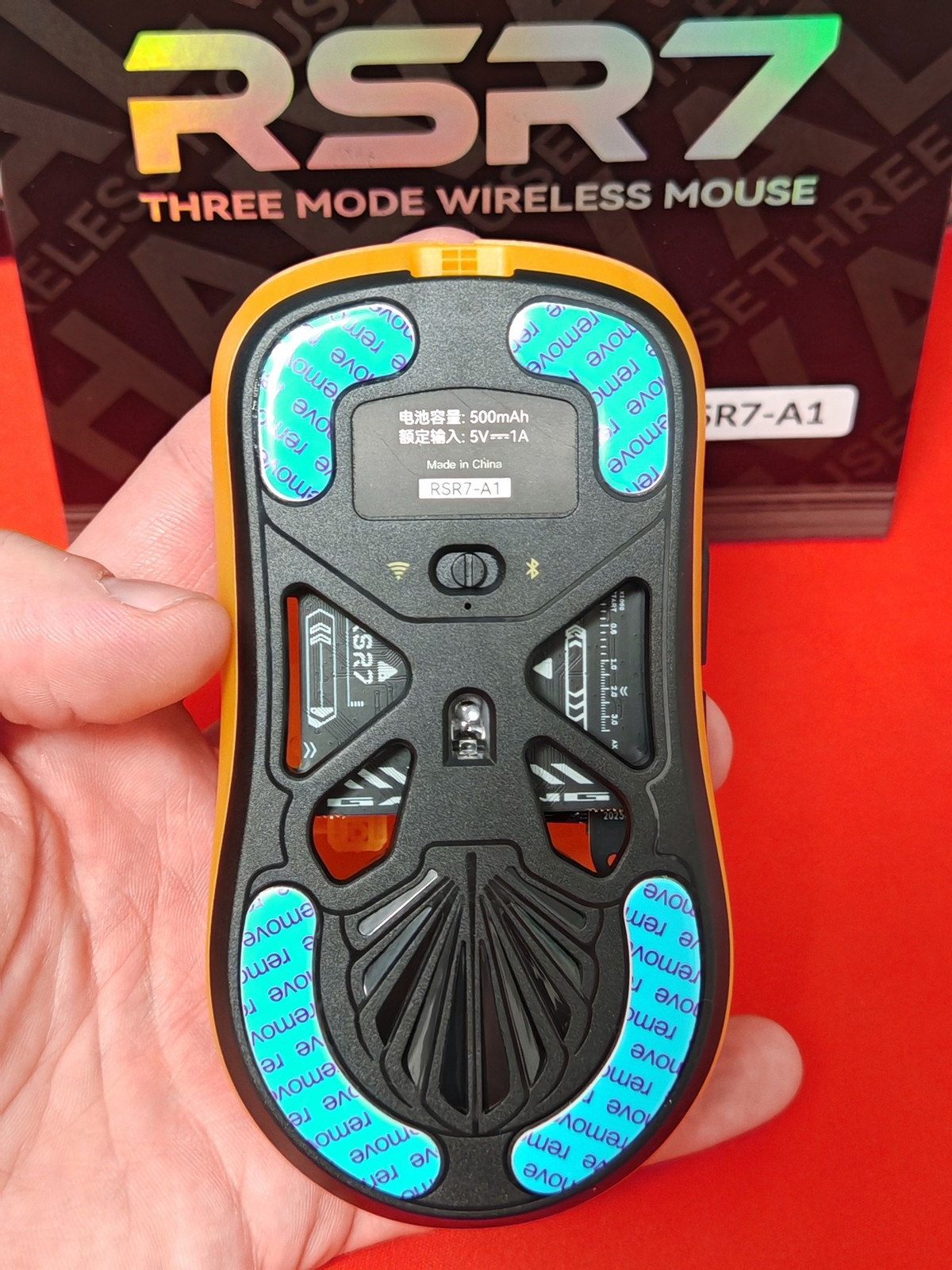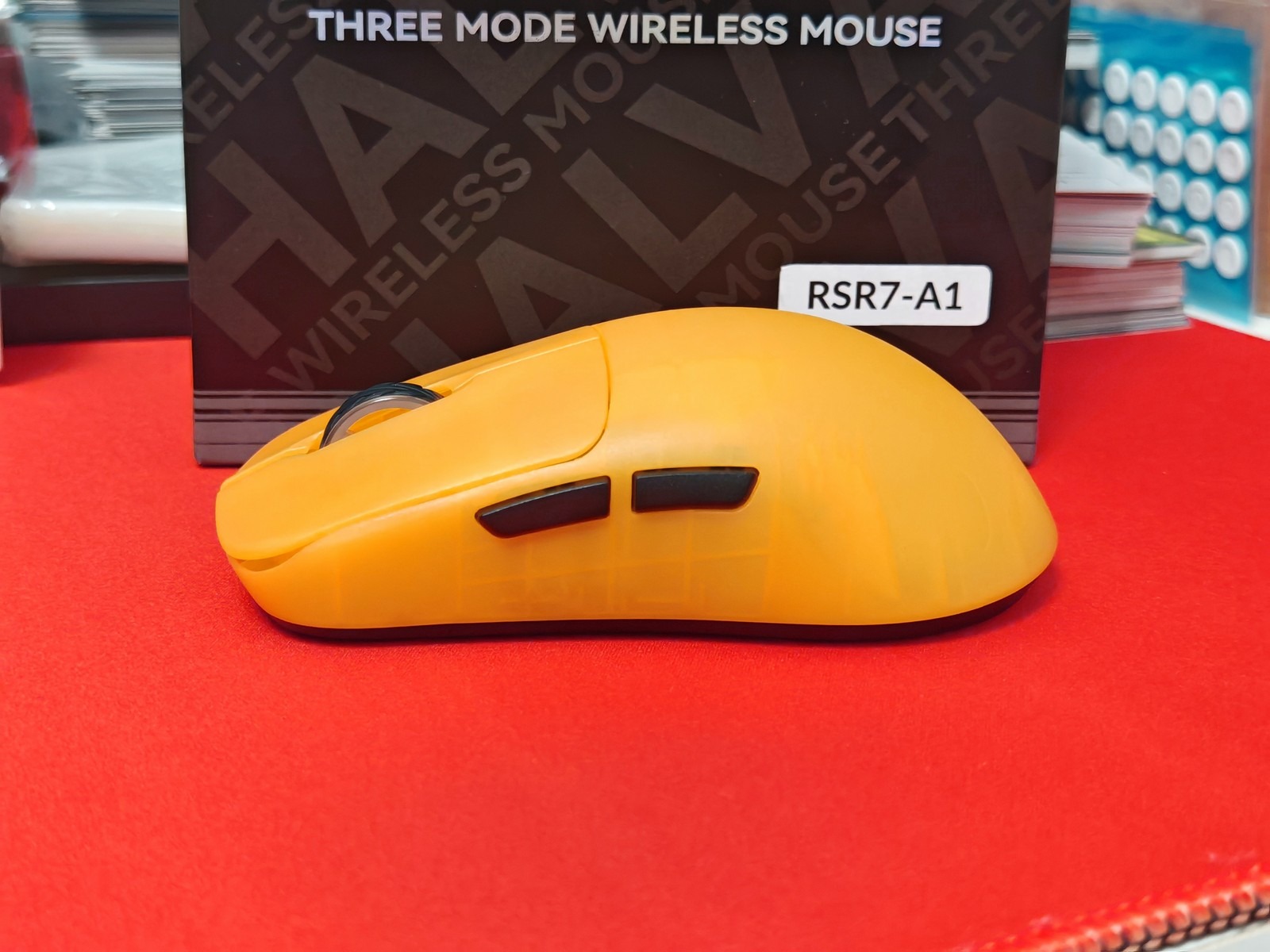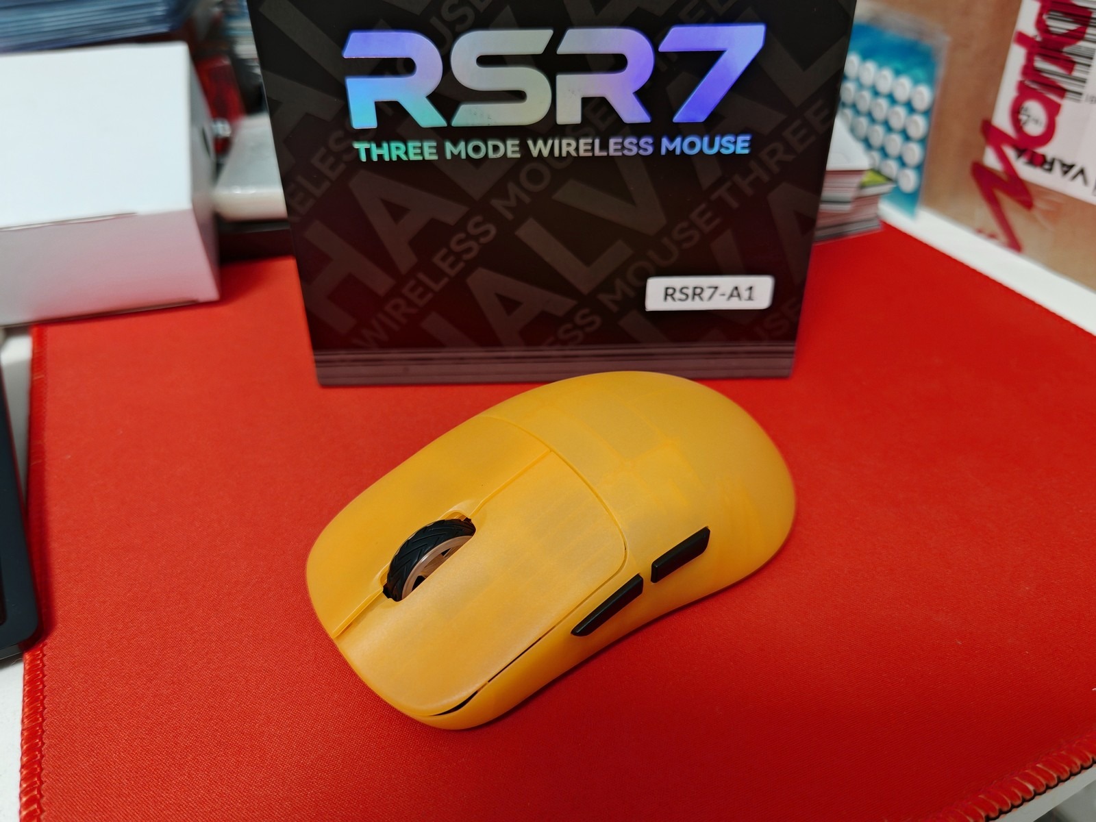 Új, szokás szerint csak a lepróbálásig és fotókig bontott termék. Belőle van saját is, egyik kedvencem lett! Ő a hosszabb akku idős verzió. Formára ugyan egyedi de hasonlít a Ninjutso Sora vagy a Pulsar X2 szériára pl. Egyedi megjelenésű sárga átlátszó házat kapott fekete gombokkal és görgővel. Nagyon jó érzetű Huano switchek és F-switch encoder fokozza majd az élményt. Emellett egy gyári méretű és 8db nagyobb dot skates is jár hozzá extrába.