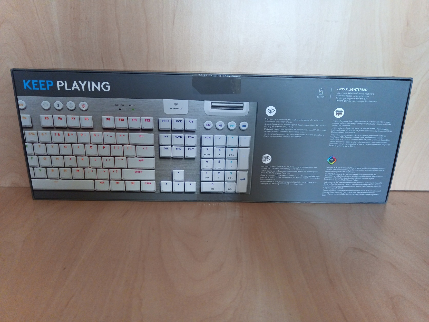 Gamer billentyűzet - gamer, vezeték nélküli, háttérvilágítással, alacsony profilú billentyűzet, Logitech GL Tactile kapcsolók, programozható makró gombok, amerikai (nemzetközi) kiosztás, Bluetooth, Lightspeed és USB-C bemenet, Li-pol elemmel működik.