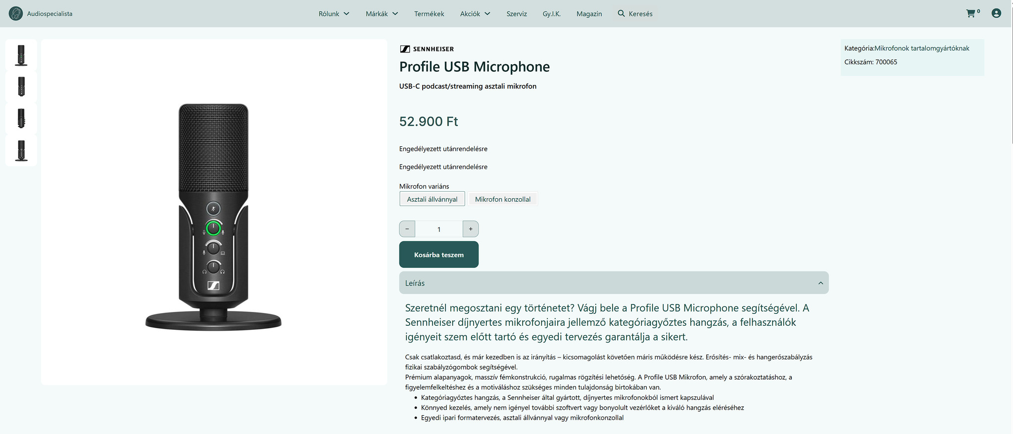 Eladó a képeken látható műszakilag és esztétikailag IS kifogástalan és új állapotban lévő, egyetlen egy alkalommal használt Sennheiser Profile USB Mikrofon saját dobozában, minden tartozékkal, 2027.10.06.-ig szóló, magyar (Audiospecialista) garanciával. Saját dobozában volt tárolva, poros se lett soha.