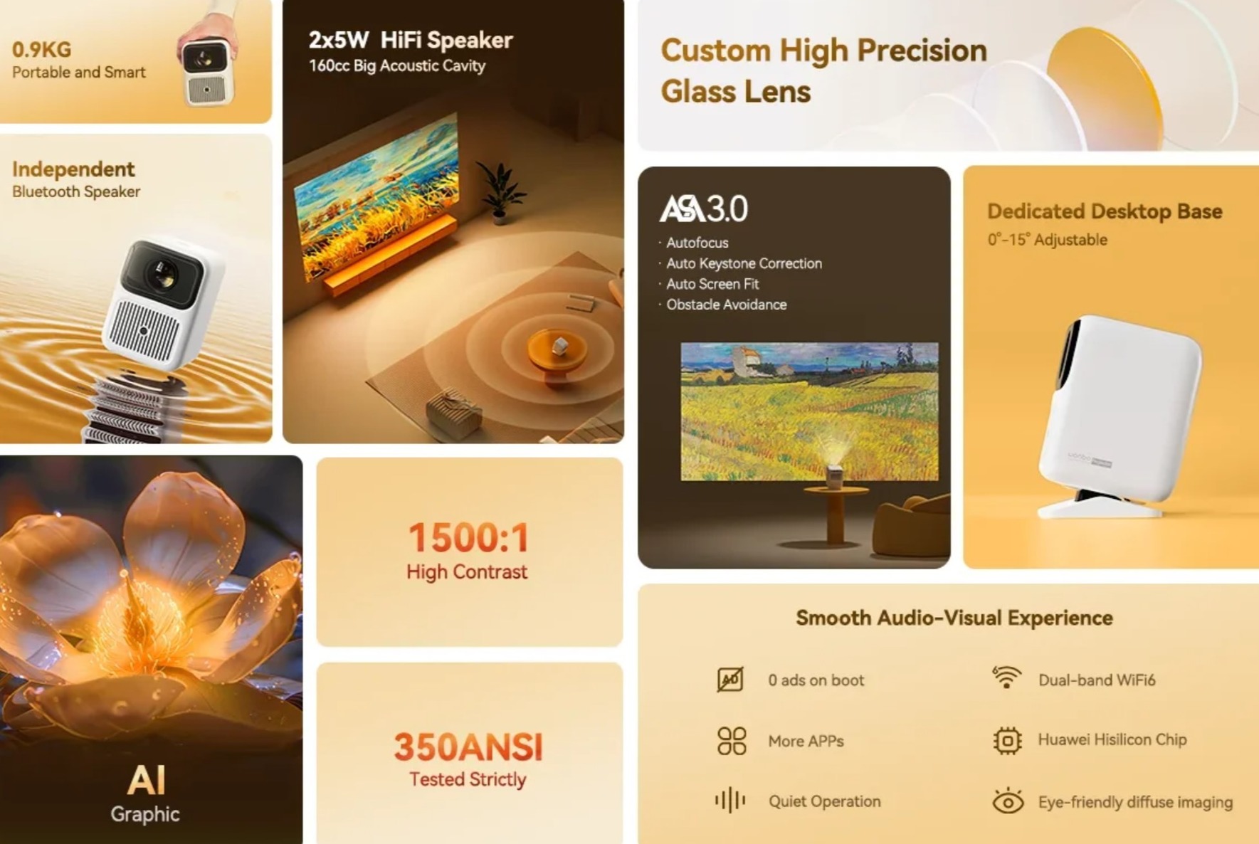 A Dali 1 projektor a Wanbo új (2024 nyarán bemutatott) belépő szintű, de már HD-felbontású, hordozható (mindössze 900g tömegű) projektora és/vagy Bluetooth hangszórója.