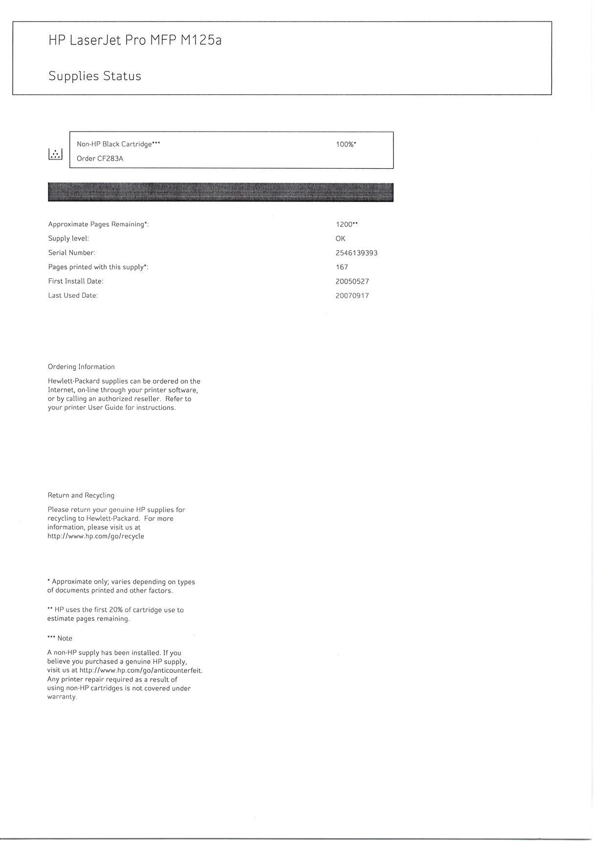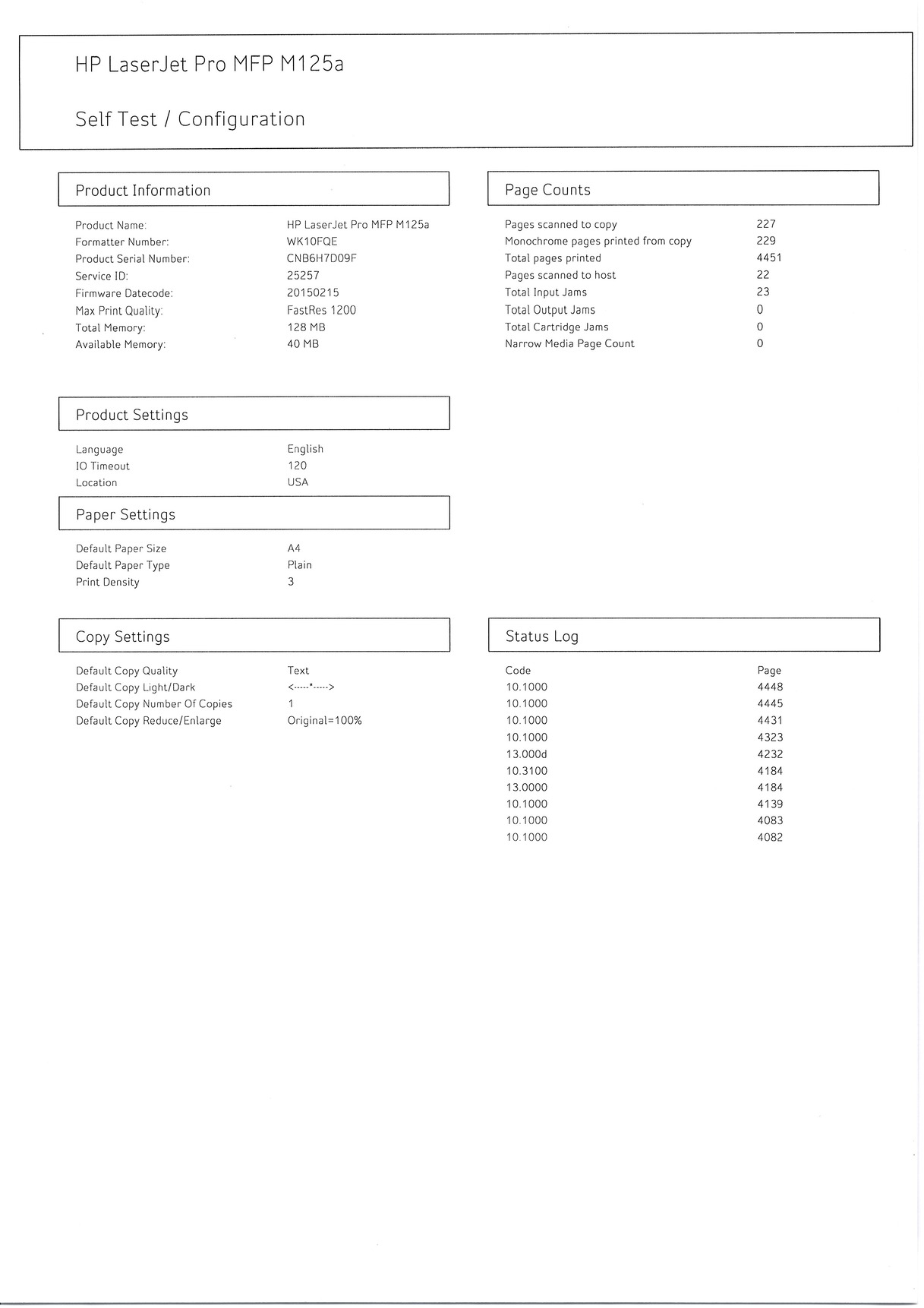 A gép élete során összesen mindössze 4451 oldalt nyomtatott. Egy lézernyomtató esetében ez szinte bejáratós állapotnak számít. A gépben jelenleg egy utángyártott festékkazetta található , amelynek a szintje 100%-os. Ezzel a kazettával eddig 167 oldal lett nyomtatva , és a gép becslése szerint még körülbelül 1200 oldal nyomtatására elegendő.