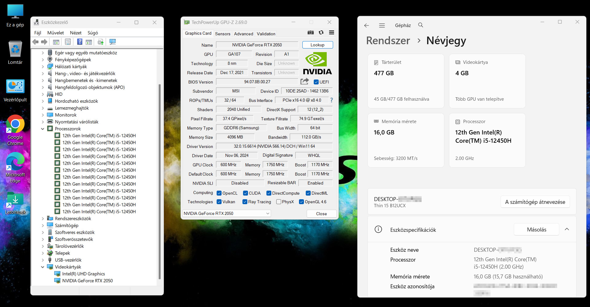 - Videókártya: NVIDIA GeForce RTX 2050 Laptop GPU, 4 GB GDDR6, dedikált