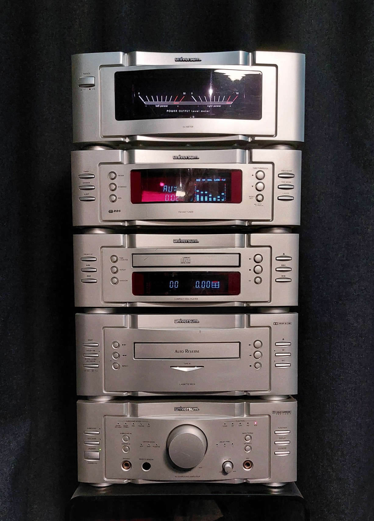 A hirdetett Universum V-4085 egy elemekből álló surround rendszerű hifi rendszer, melyhez saját hangfal szett és állvány is vásárolható volt. A teljes kiépítés nem számított nagyon olcsónak, mert mindennel együtt 1.500 Euro körül volt az új ára.