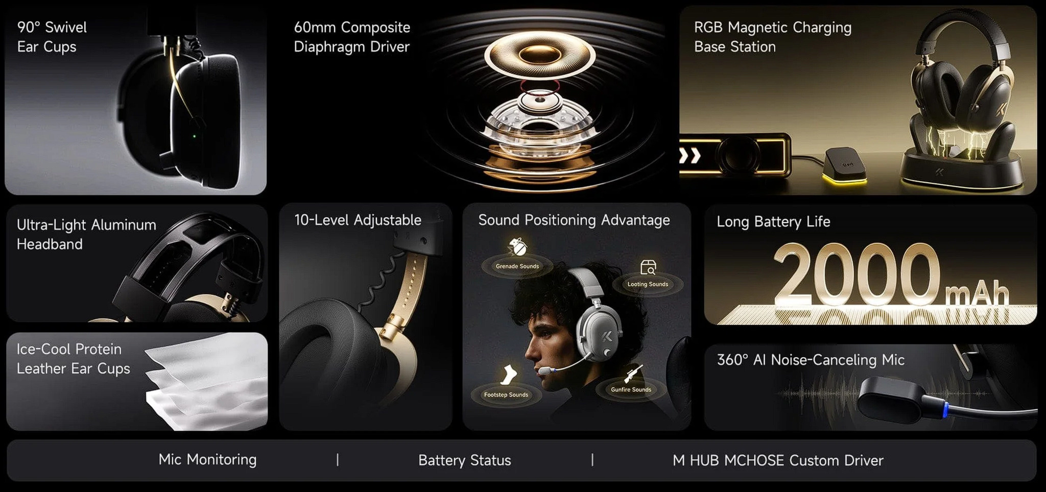 Iszonyat kényelmes, 2 szett fülpárna, mágneses RGB töltő állomás, levehető (meglepően jó) zajcsökkentéses mikrofon, 60 mm-s driver, 7.1 virtual sound, 2000 mAh akku; MCHOSE M HUB Driver (asztali alkalmazás).