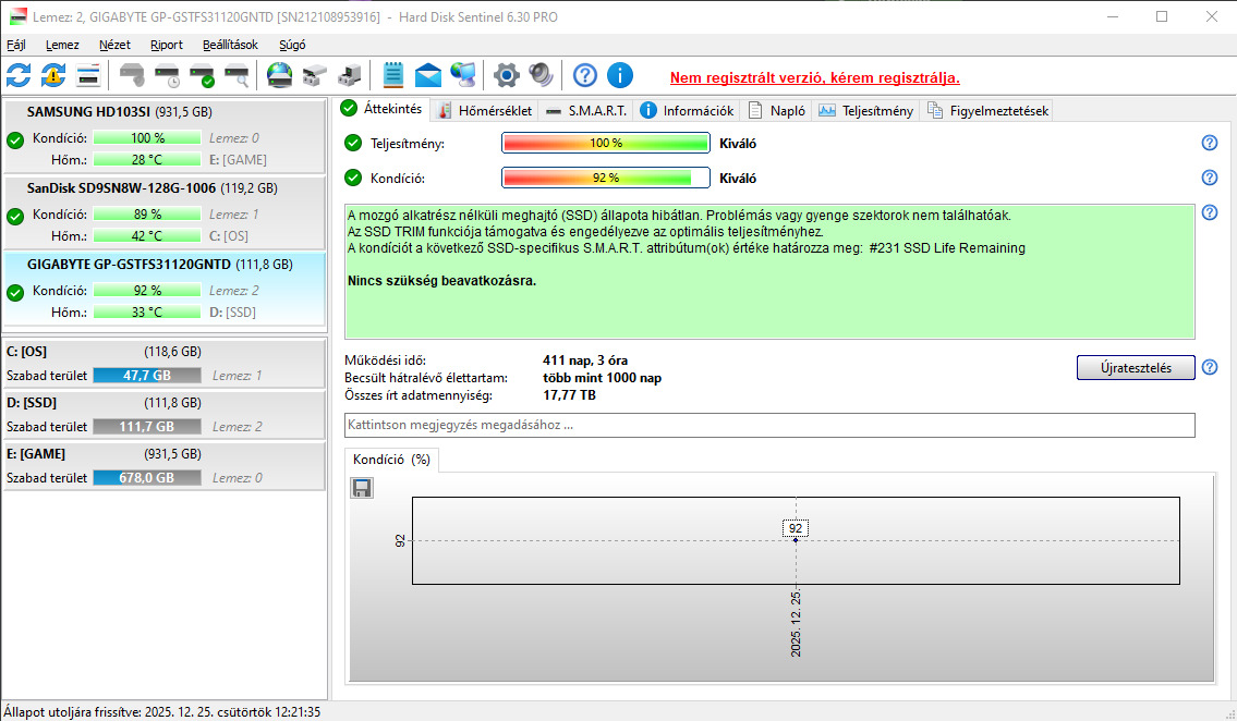 - Gigabyte GP-GSTFS31120GNTD (120GB) / Állapot: 100/92 / Napok száma: (411) (2db menet hiányzik az oldalán!) (3K)