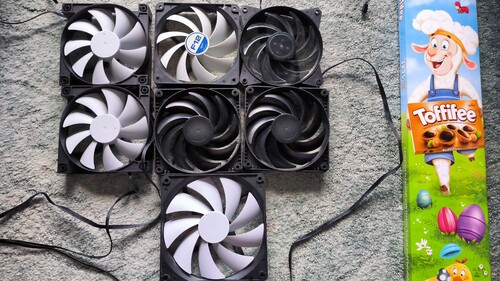 A 2 Phanteks pwm-es, a többi 3 pines csatlakozóval rendelkezik. A fehérek NZXT, az egyik Arctic, az átlátszó lapátos pedig Cm márkájú.