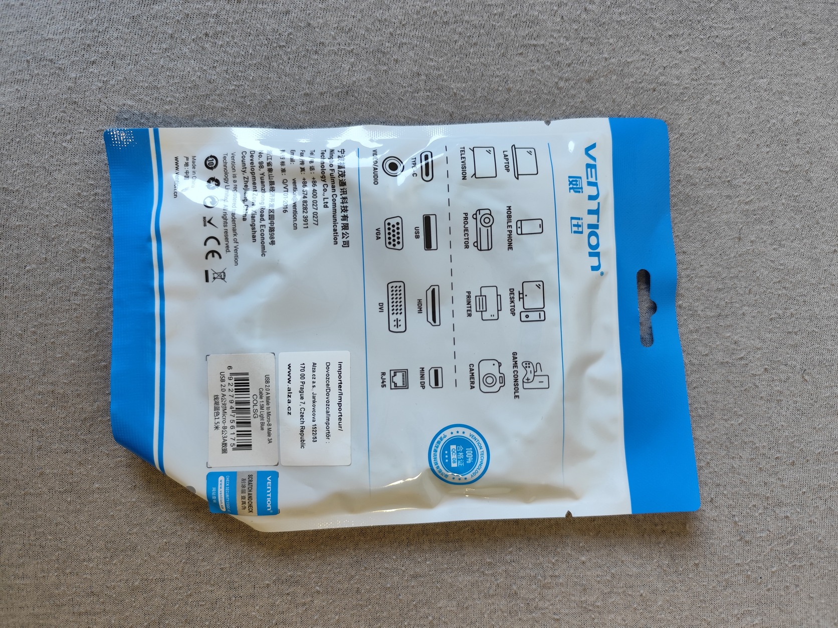 Eladó egy új Vention márkájú, 1.5 méteres, világoskék Micro USB kábel eredeti csomagolásában.