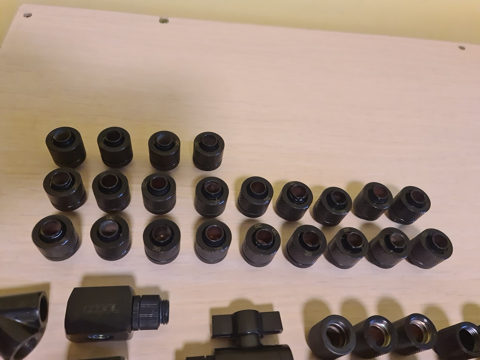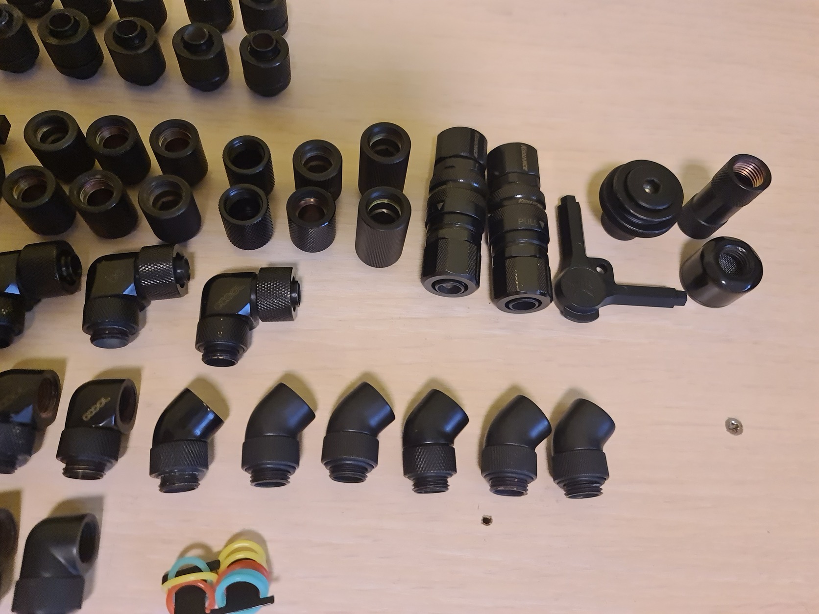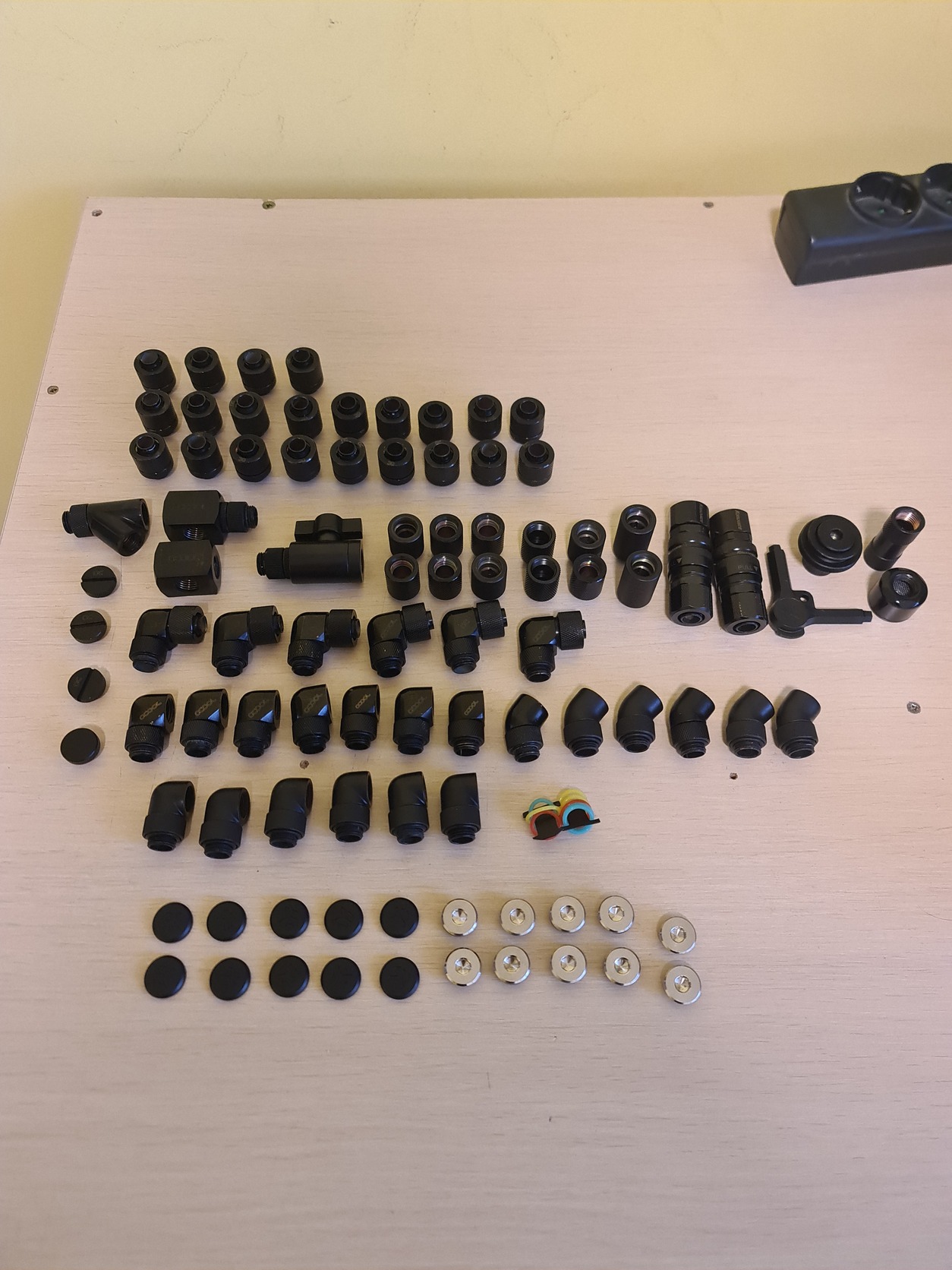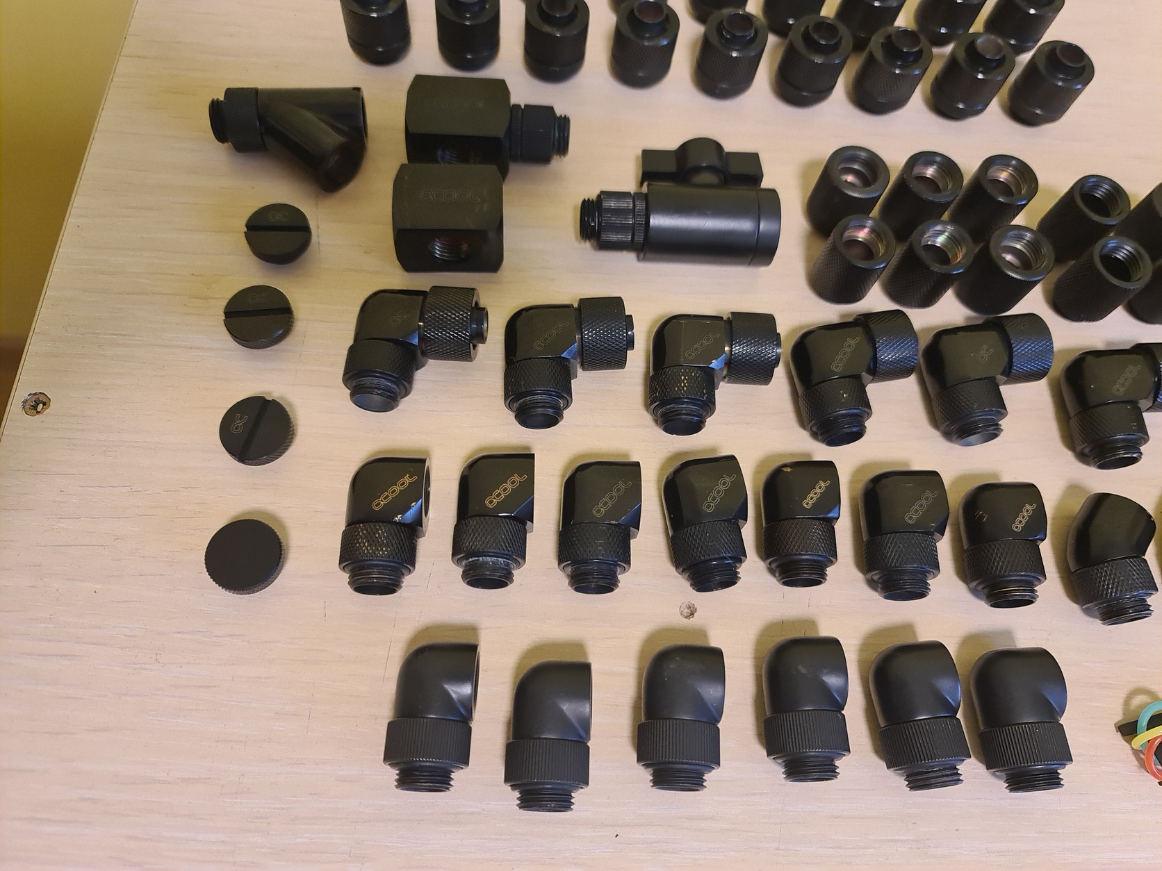 A cső 10/13as kb 7m van mimdenféle extra toldó, szűrő, 90/45fokos adapter ami csak kelhet. Minden hollandis csatlakozó 10/13as. Nagyon sok új vagy 1x beépített vannak kicsit kopottabak is. Ami nincs a képen. 280x60mmes alphacool radiátor és 1db 420x60mm es alphacool radiátor. Továbbá 8db 140mm-es piros fekete prémium ventik.