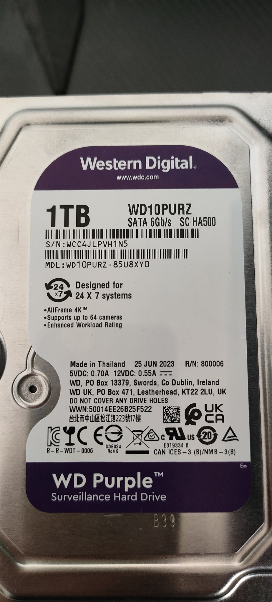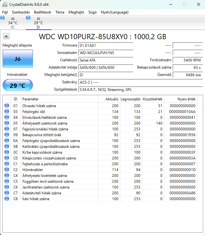 Eladó egy tökéletesen működő WD10PURZ 1TB-os HDD