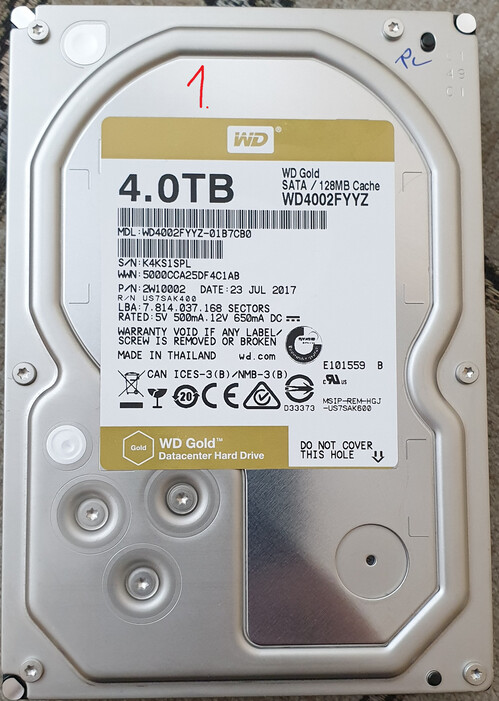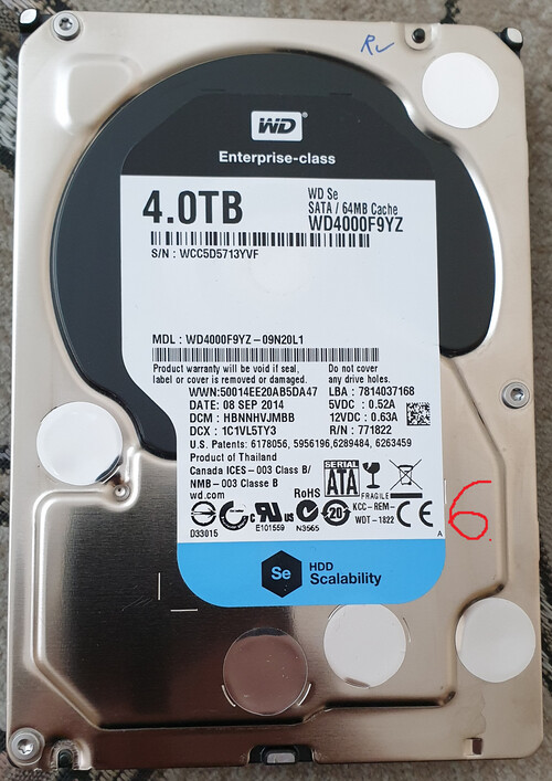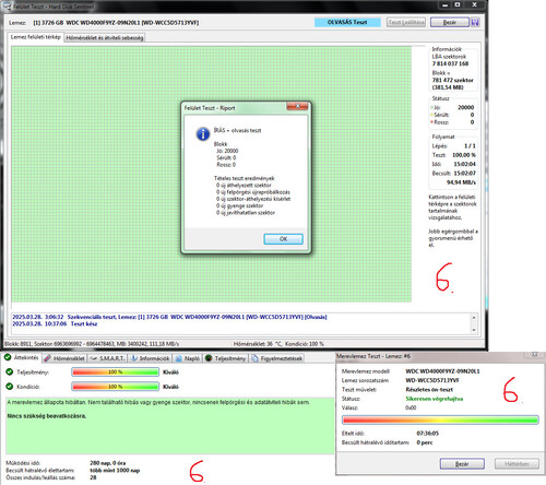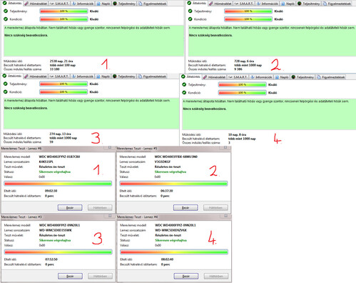 1. WDC WDC WD4002FYYZ-01B7CB0 4TB 7200RPM CMR 100/100 - 2538nap 21óra 16indulás 33230 parkolás 21k6. WDC WDC WD4000F9YZ-09N20L1 4TB 7200RPM CMR 100/100 - 280nap 0óra 28indulás 24k