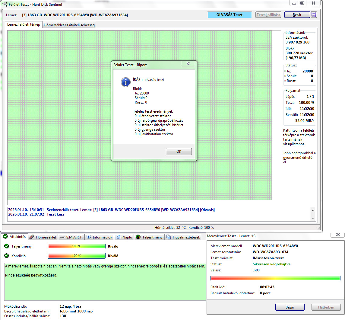 WDC WD20EURS-63S48Y0 2TB 5400RPM CMR 100/100 - 12nap 4óra 130indulás - 15k