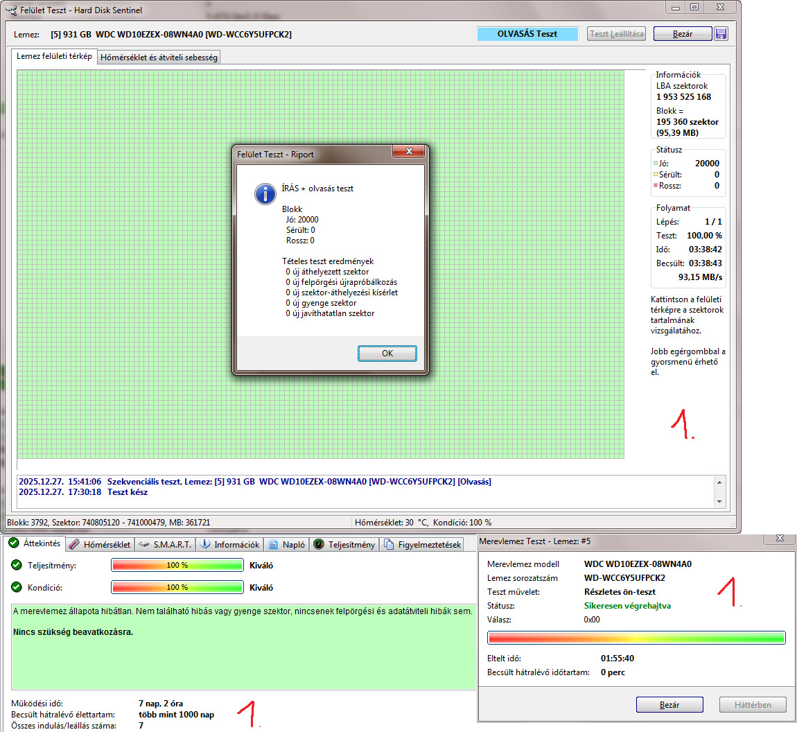 Teljes írás-olvasás felületteszt és Részletes önteszt lefutott.