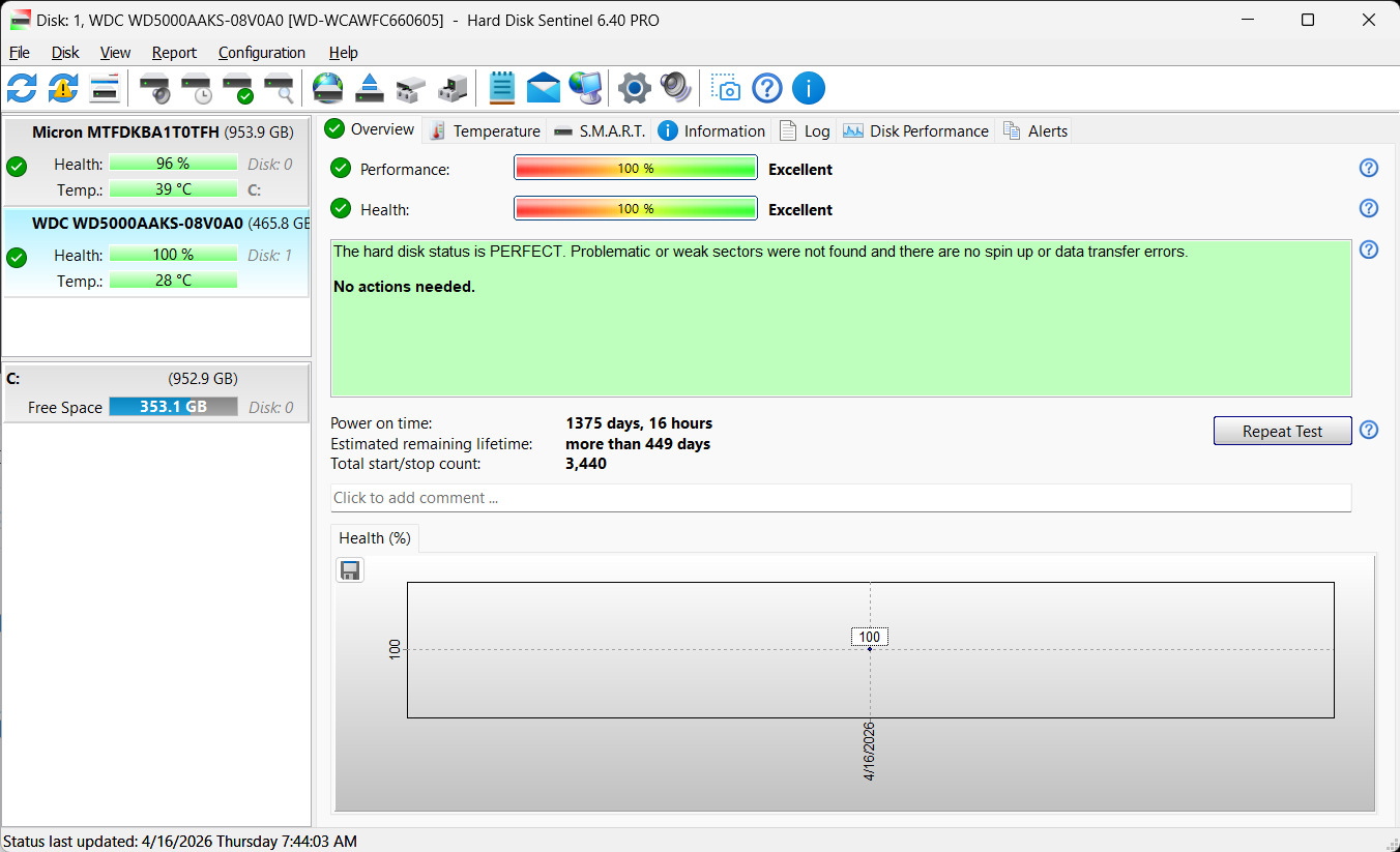WD WD5000AAKS 500GB, 1374 nap, 100/100 - 3500 Ft