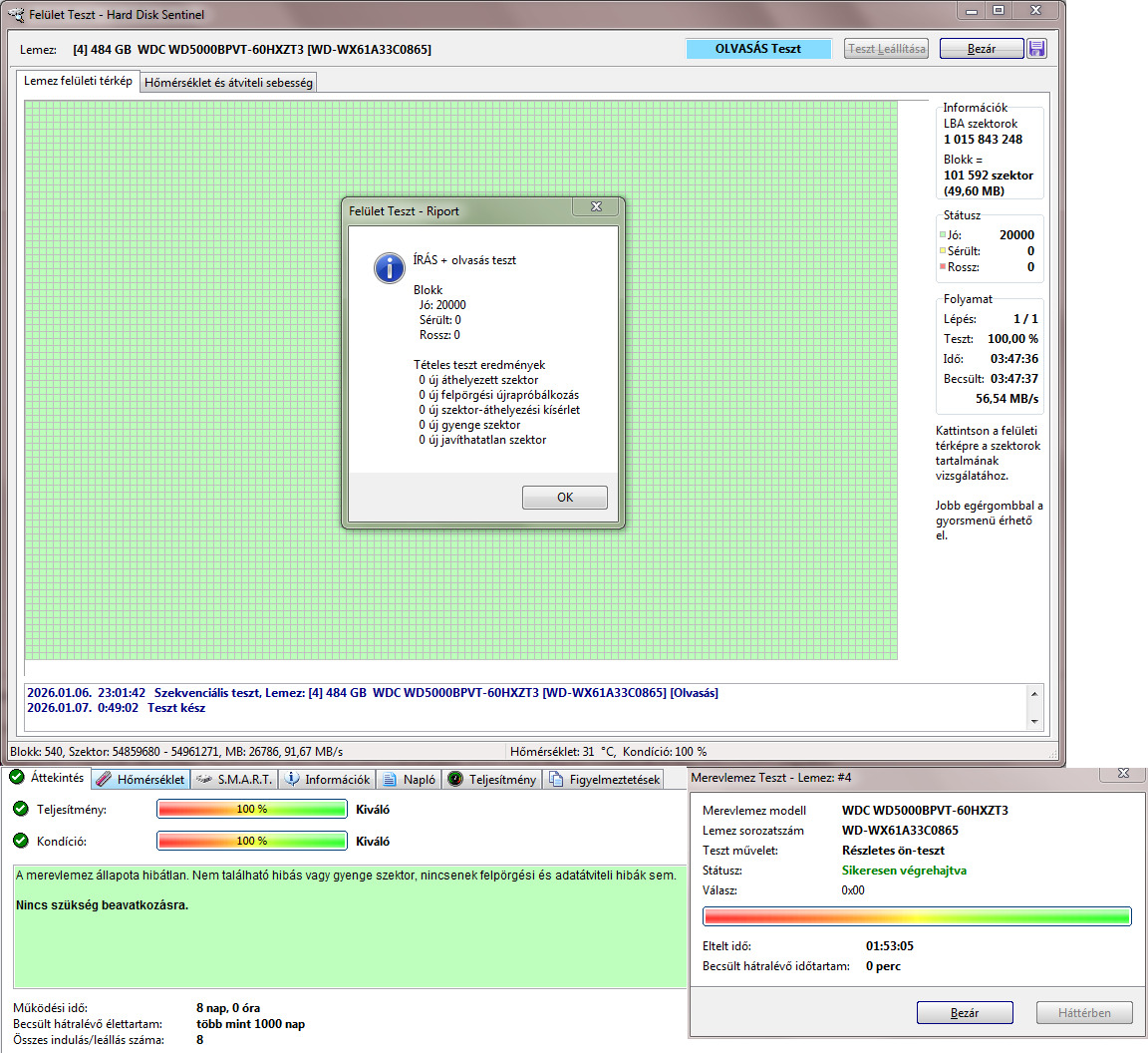 Teljes írás-olvasás felületteszt és Részletes önteszt lefutott.