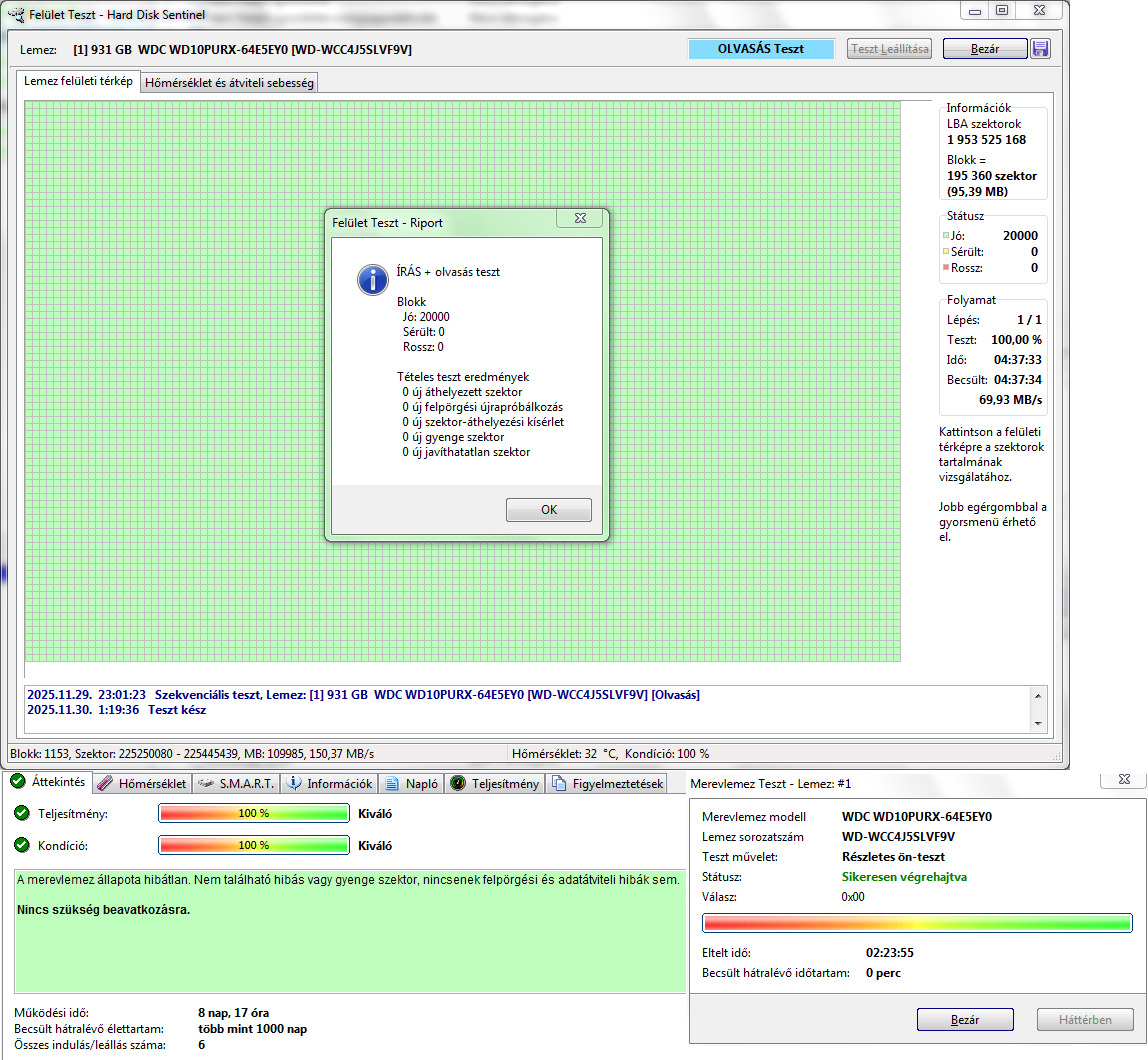 Teljes írás-olvasás felületteszt és Részletes önteszt lefutott.