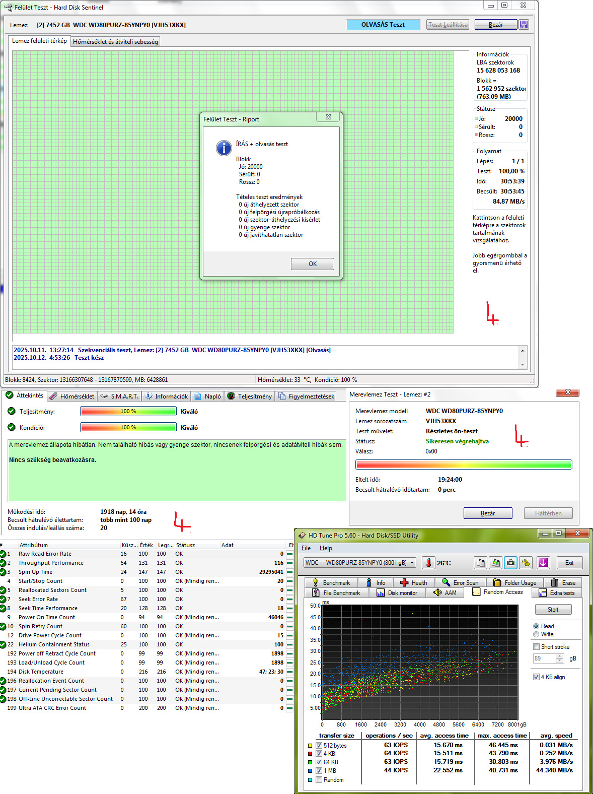 1. WDC WD80PURZ-85YNPY0 8TB 7200RPM CMR 100/100 - 1910nap 21óra 21indulás - 38k2. WDC WD80PURZ-85YNPY0 8TB 7200RPM CMR 100/100 - 1914nap 4óra 13indulás - 38k3. WDC WD80PURZ-85YNPY0 8TB 7200RPM CMR 100/100 - 1914nap 22óra 20indulás - 38k4. WDC WD80PURZ-85YNPY0 8TB 7200RPM CMR 100/100 - 1918nap 14óra 20indulás - 38k
