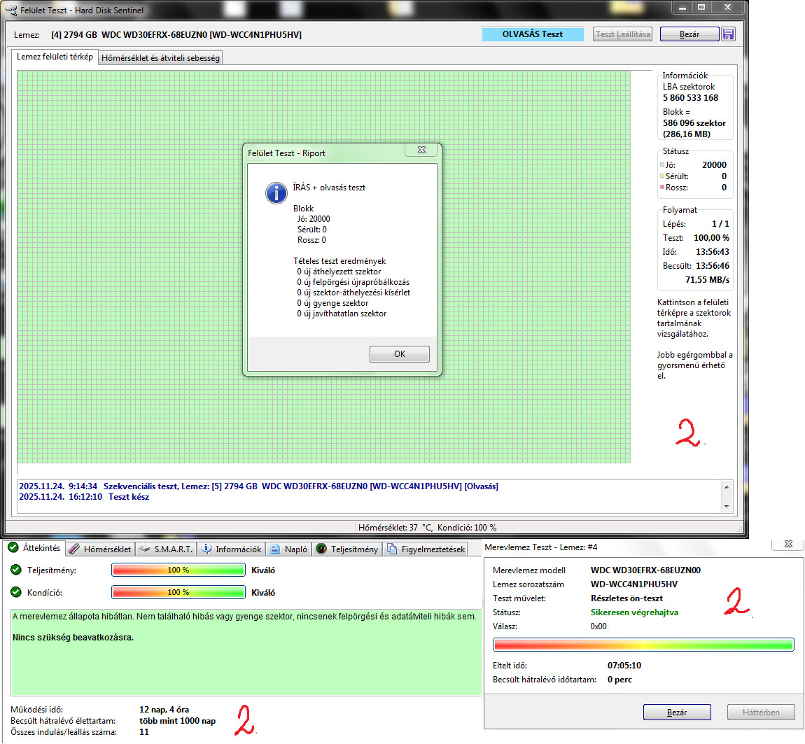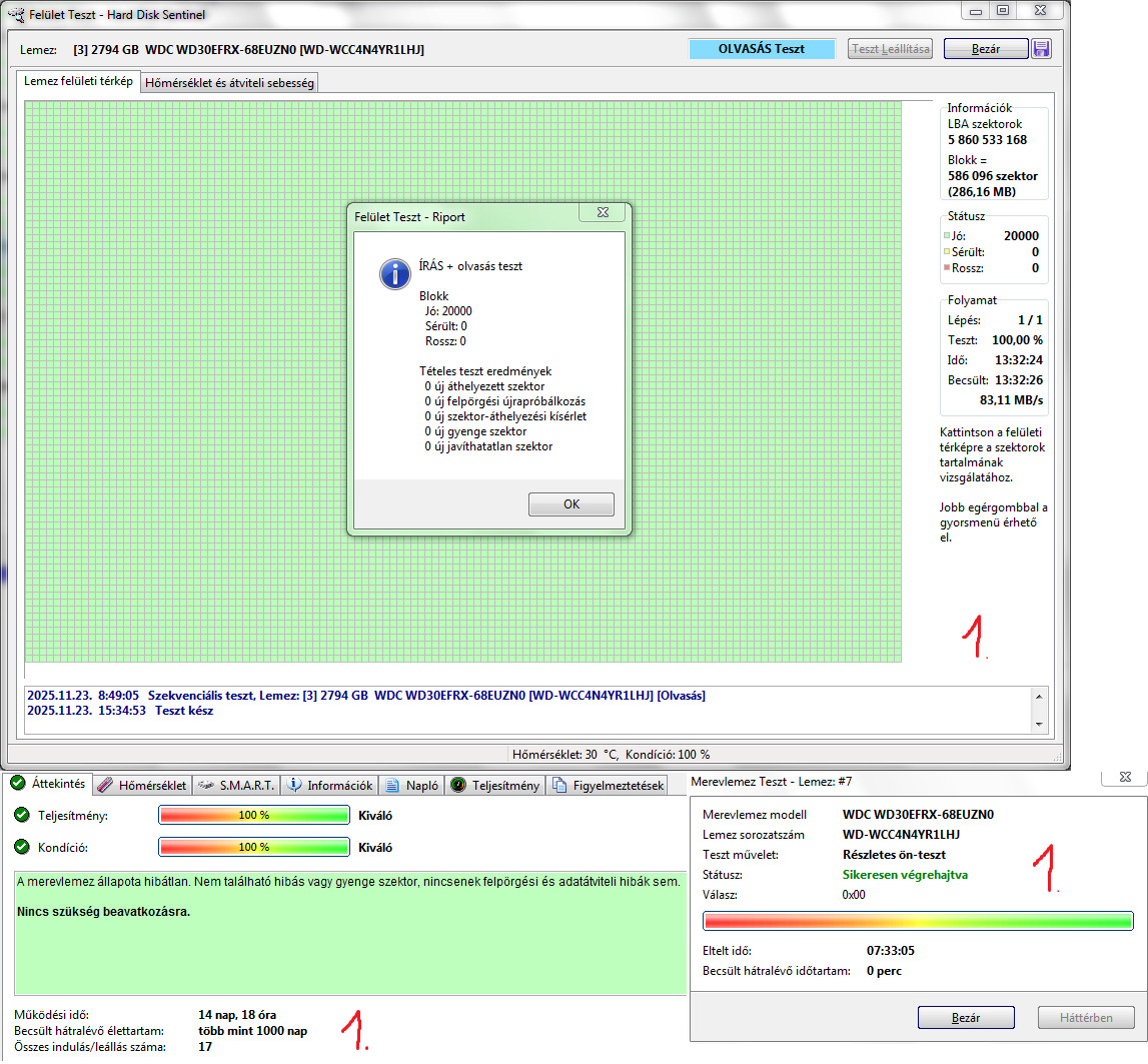 1. WDC WD30EFRX-68EUZN0 3TB 5400RPM CMR 100/100 - 14nap 18óra 17indulás - 22k2. WDC WD30EFRX-68EUZN0 3TB 5400RPM CMR 100/100 - 12nap 4óra 11indulás - 22k