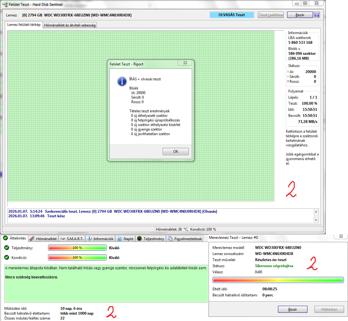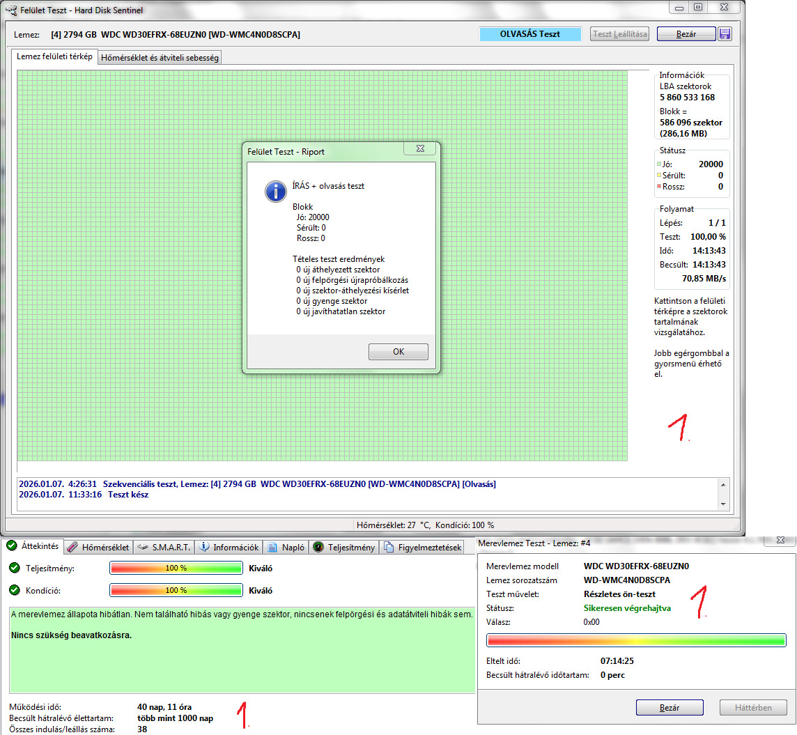 1. WDC WD30EFRX-68EUZN0 3TB 5400RPM CMR 100/100 - 40nap 11óra 38indulás - 23k2. WDC WD30EFRX-68EUZN0 3TB 5400RPM CMR 100/100 - 10nap 6óra 22indulás - 23k
