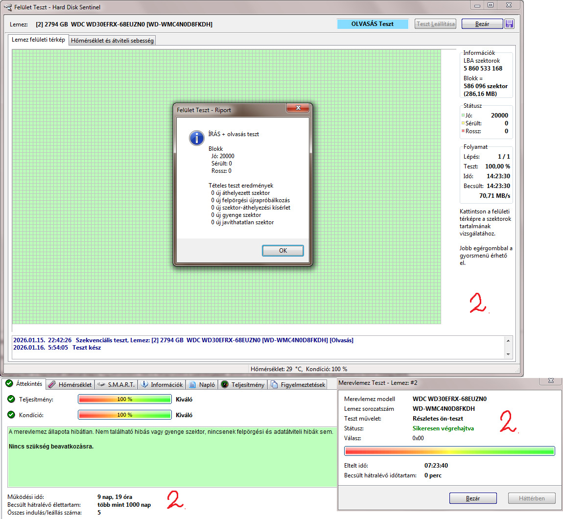 1. WDC WD30EFRX-68EUZN0 3TB 5400RPM CMR 100/100 - 24nap 19óra 16indulás - 25k2. WDC WD30EFRX-68EUZN0 3TB 5400RPM CMR 100/100 - 9nap 19óra 5indulás - 25k