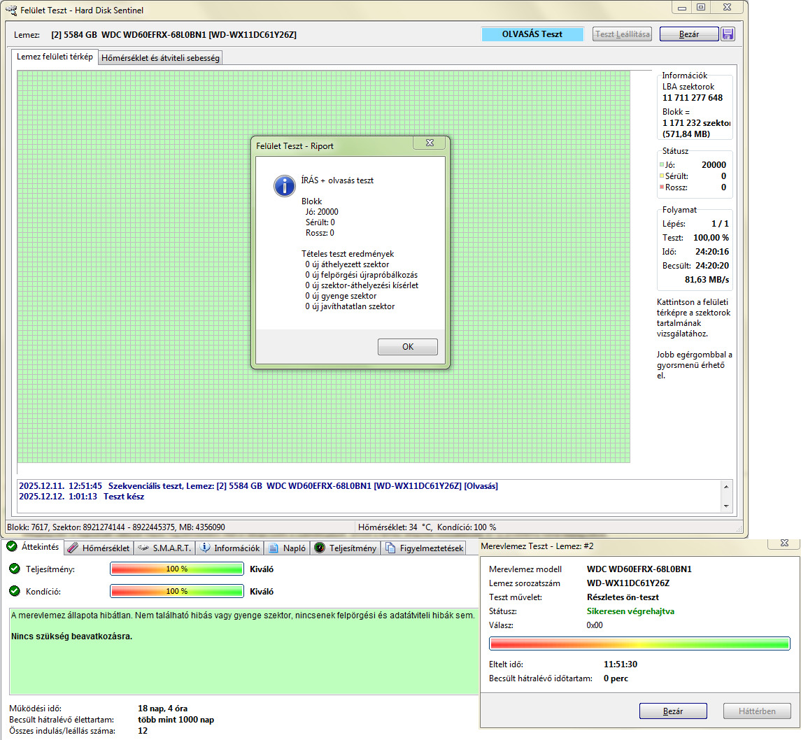 Teljes írás-olvasás felületteszt és Részletes önteszt lefutott.