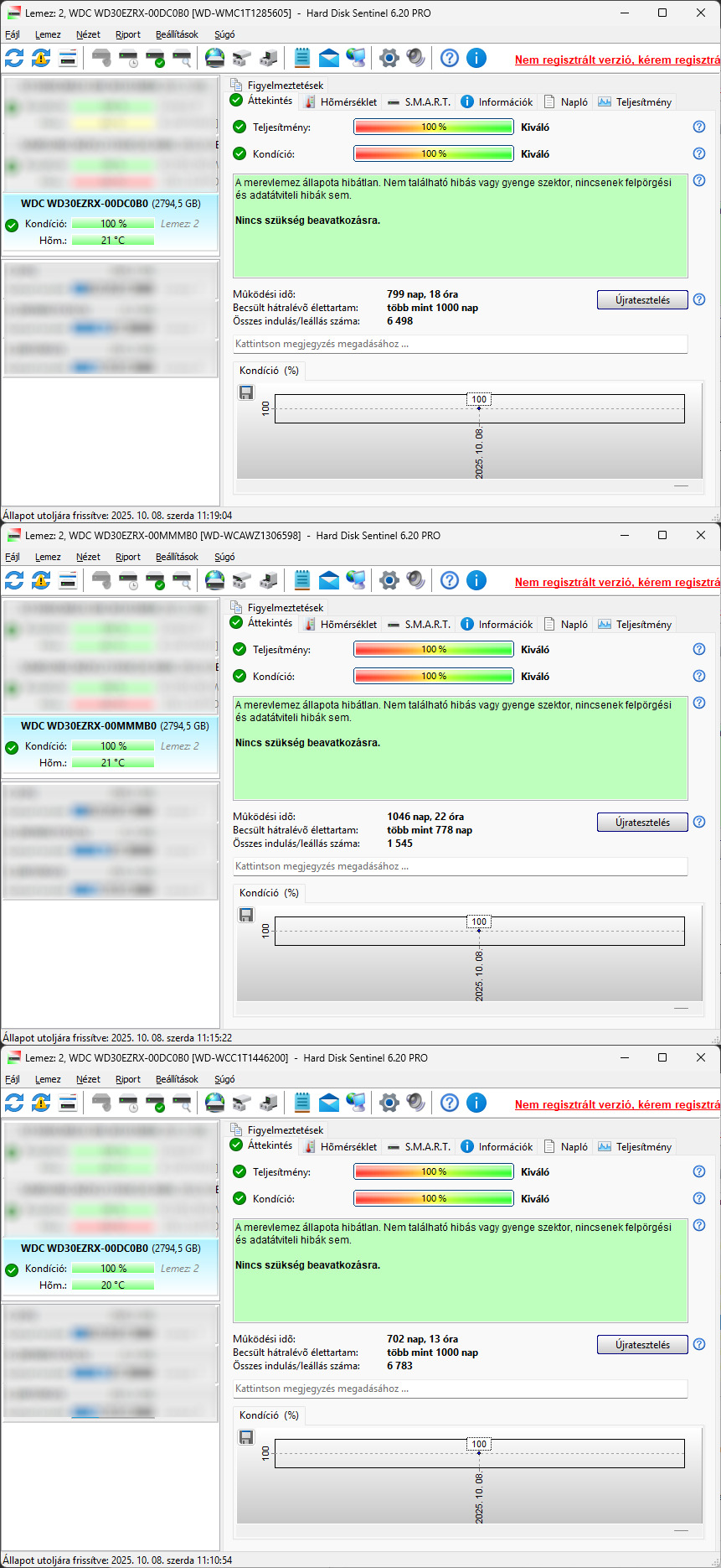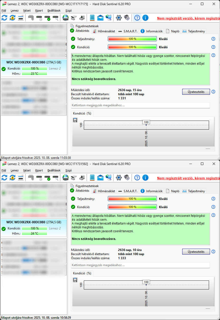 Bár "zöldek", NAS-ban voltak használva. Mivel az energiatakarékos funkciók nem lettek kikapcsolva, egy idő után a NAS-tól függetlenül is leállították magukat, ezért viszonylag magas az indulás/leállás értékük. (Ezért nem "illik" egyébként NAS-ban használni a zöldeket. A WD Drive Utilities-ban elvileg lehet a sleep timert állítani, de én nem akartam ezzel mókolni.)