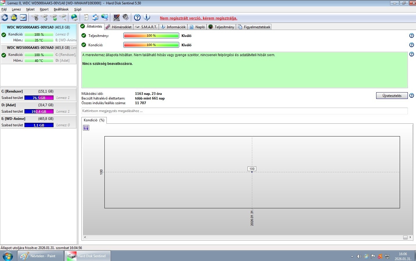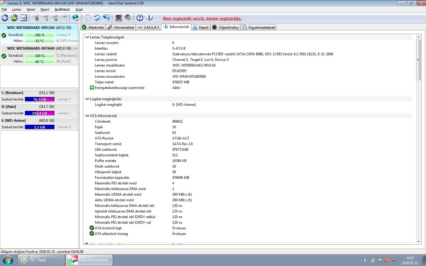 Eladó Western Digital 500 GB 16 MB 7200 rpm SATA2 (WD5000AAKS-00V1A0) 100%-os merevlemez.