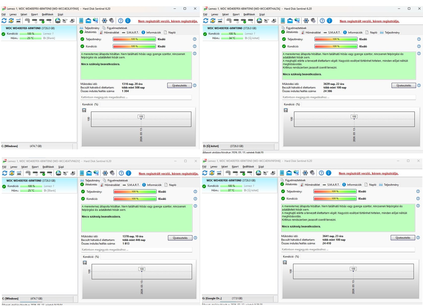 8. WD40EFRX-68WT0N0 - 100%/100% Működési idő: 3641 nap, Indulások száma: 24410 Ár: 14.000Ft