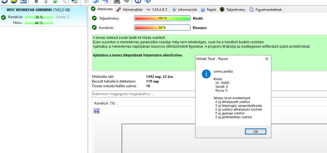Sajnos a kolléga decemberben ezzel a merevlemezzel demonstrálta, hogy "minden SATA HDD hot-swap kirántható egy Synology NAS-ból", rögtön sikerült összeszedni 44 hibás szektort.