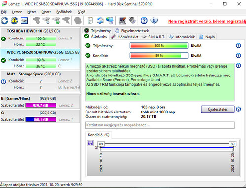 - HDSentinel alapján 100%/89%-os állapot, alacsony (20TB) írt adatmennyiséggel