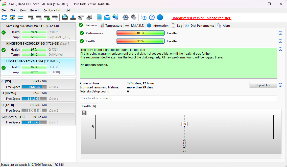 HDSentinel szerint 100/99, 1 hibás szektor.
