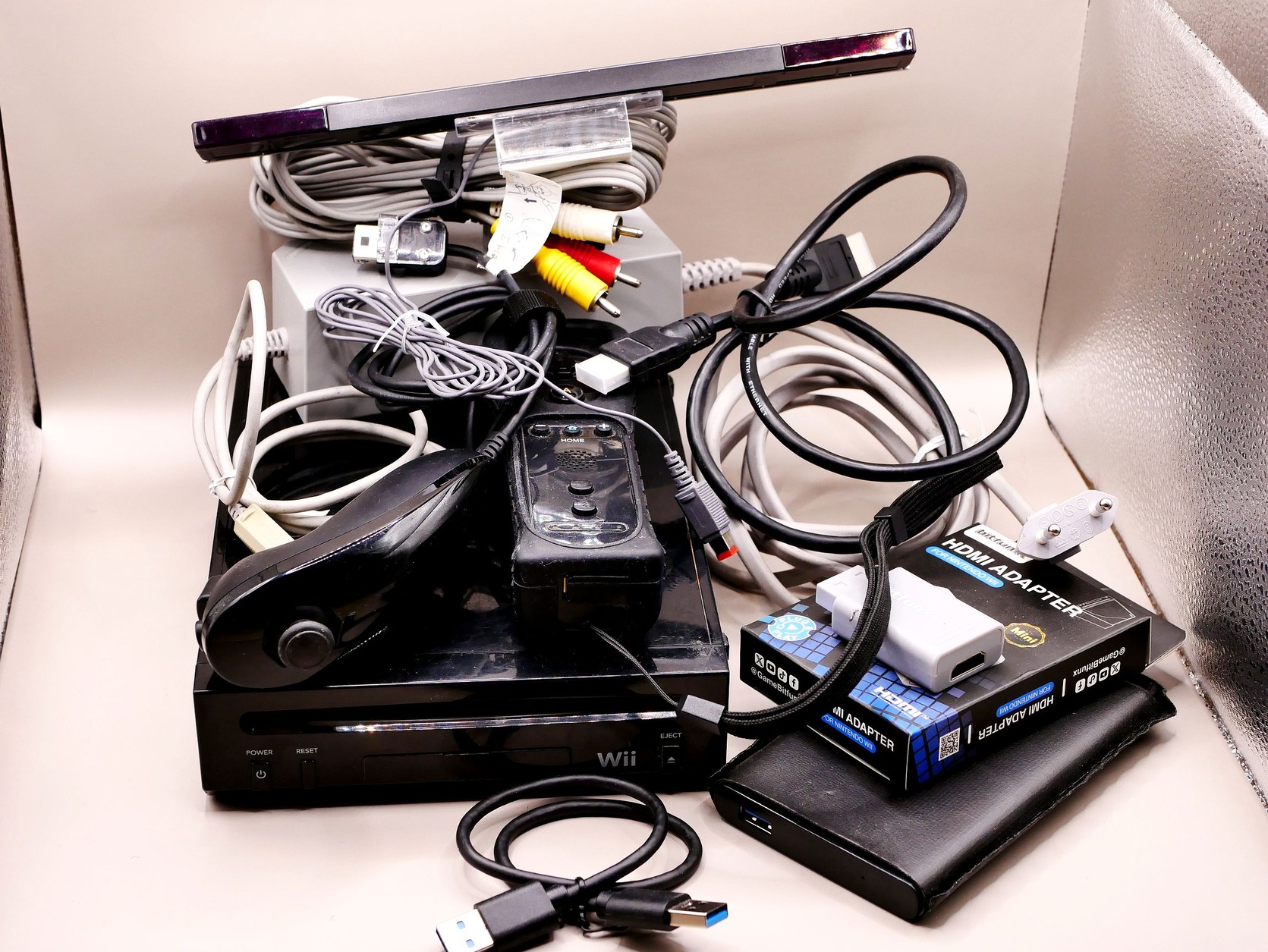 Eladó egy fekete Wii konzol minden hozzá való tartozékkal együtt. A kontroller és az infra utángyártottak, de hibátlanul működnek. Van hozzá egy külső 120GB-os SSD, válogatott legjobb Wii játékokkal (67db). Automatikusan elérhető mind a menüből. Van hozzá egy minőségi HDMI adapter és HDMI kábel, de hagyományos audio/video kábel is van hozzá.