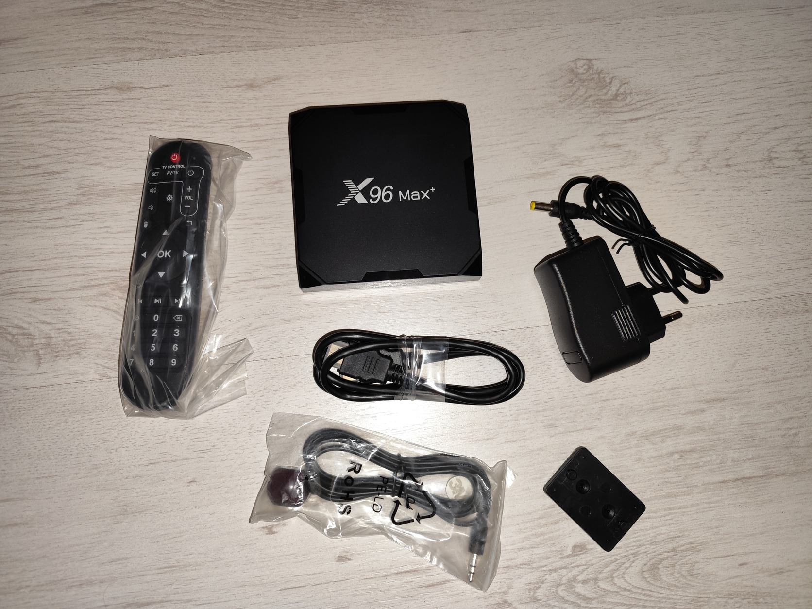 X96 MAX+ S905X3 4GB ram, 32GB flash, 1000Mbit/s ethernet 2,4/5G wifi, 32GB-os SD kártyával, dobozában, távirányítójával, HDMI kábelével és infra hosszabbítóval.