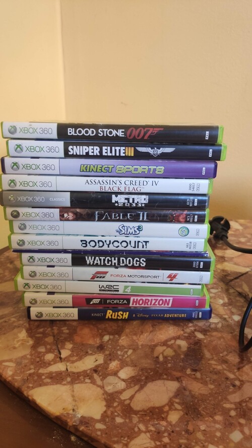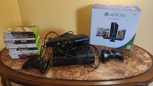 500 gigás gép RGH-zva dobozával, 14db dobozos játékkal, 3db kontrollerrel, kinecttel, kormánnyal és pedállal.