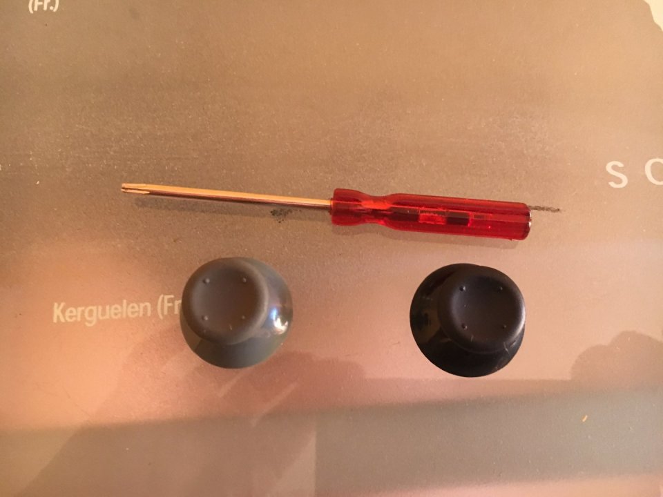 Az egyik kontroller frissen cserélt analógsapkával és aksitartóval. Ajándékba adok két új analógsapkát és a kontrollerhez való csavarhúzót. A gép kipróbálható.