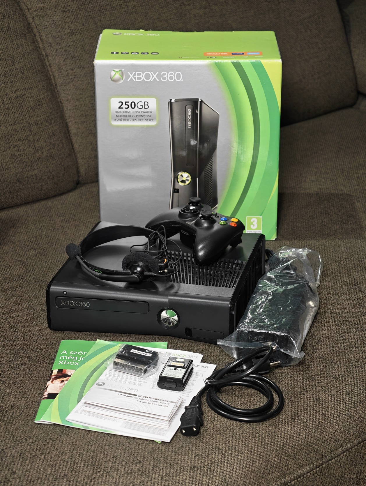 Xbox 360 Slim konzol (250GB HDD), tápegység, leírások, gyári doboz szép állapotban.