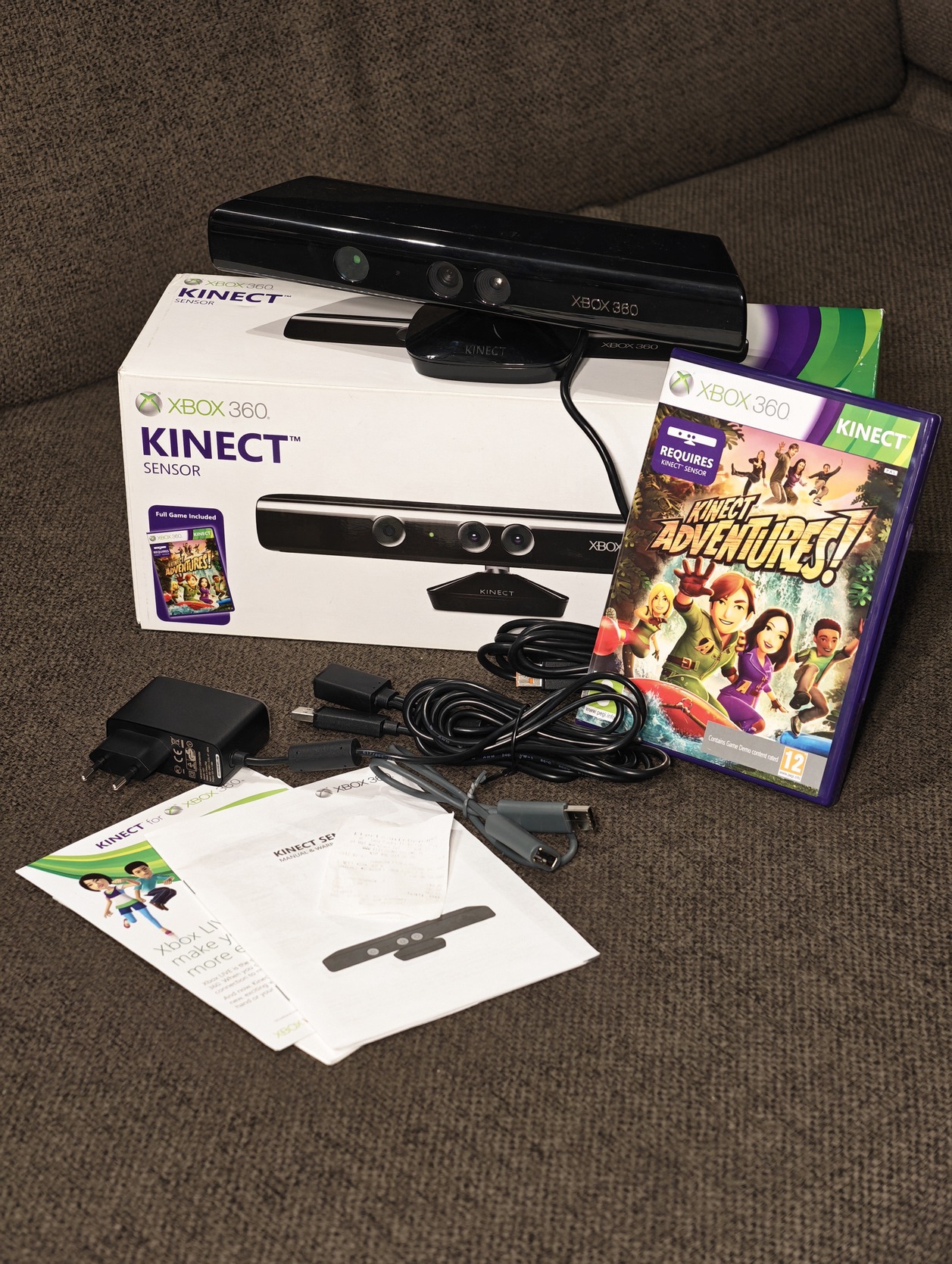Kinect szenzor, saját dobozában, kábeleivel (fat modellhez is), leírásokkal + Kinect Adventures játék.