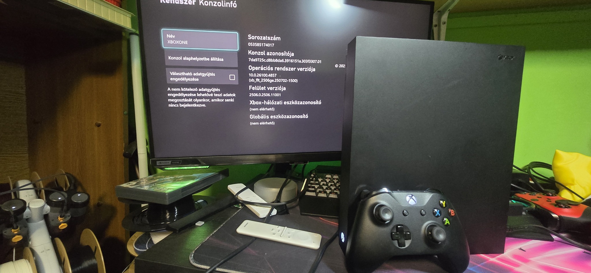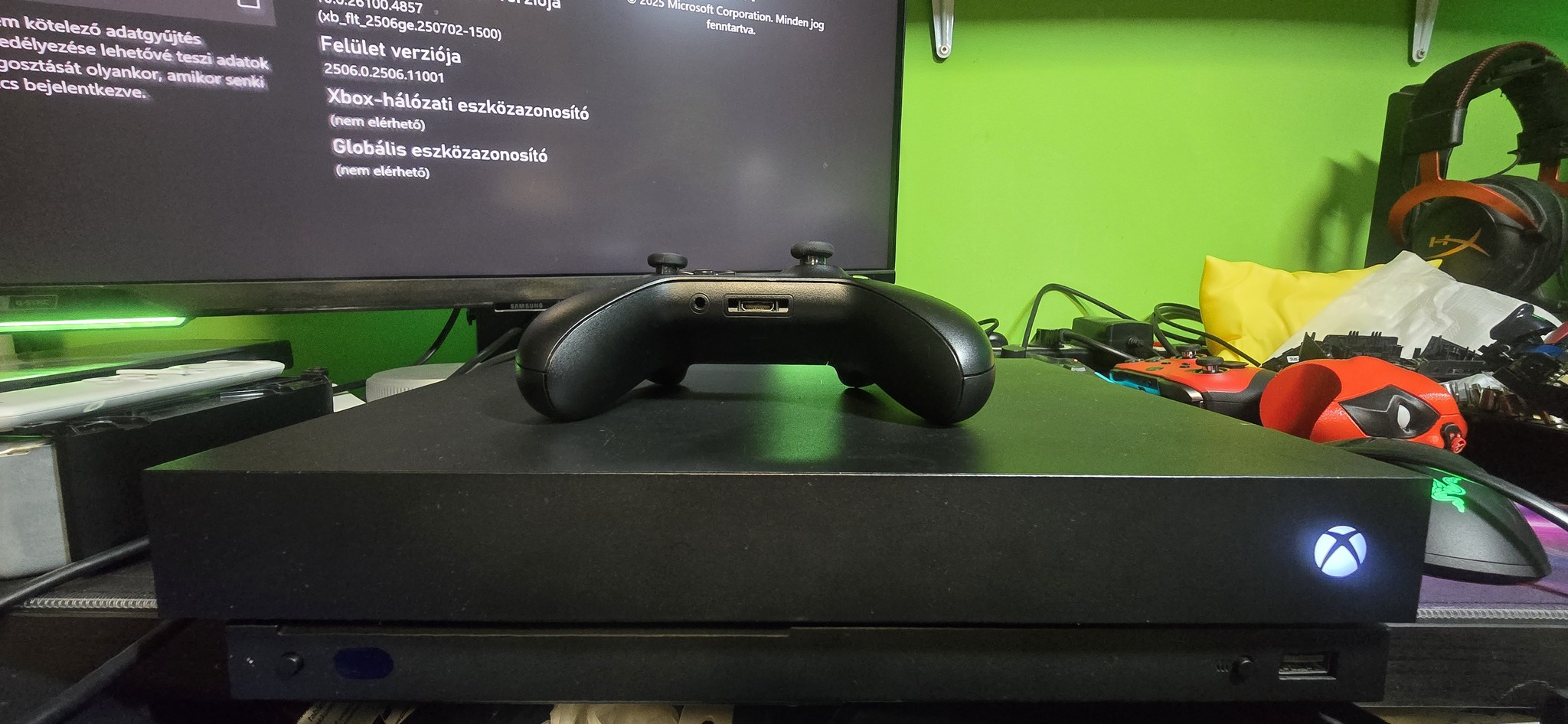 Dobozával, HDMI + tápkábellel, illetve egy fekete Xbox One kontrollerrel (nem driftel)