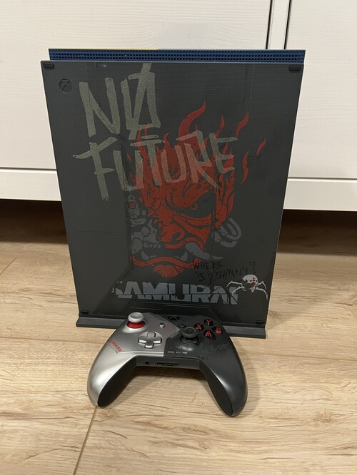 - Xbox One X 1 TB Cyberpunk edition konzol (és tartó, amivel élére állítható)