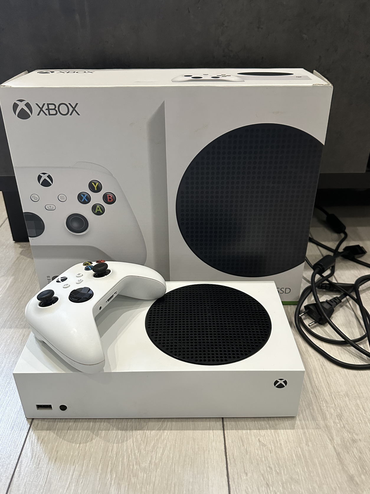 Eladó egy megkímélt állapotú Xbox Series S 512 GB konzol, fehér kontrollerrel.