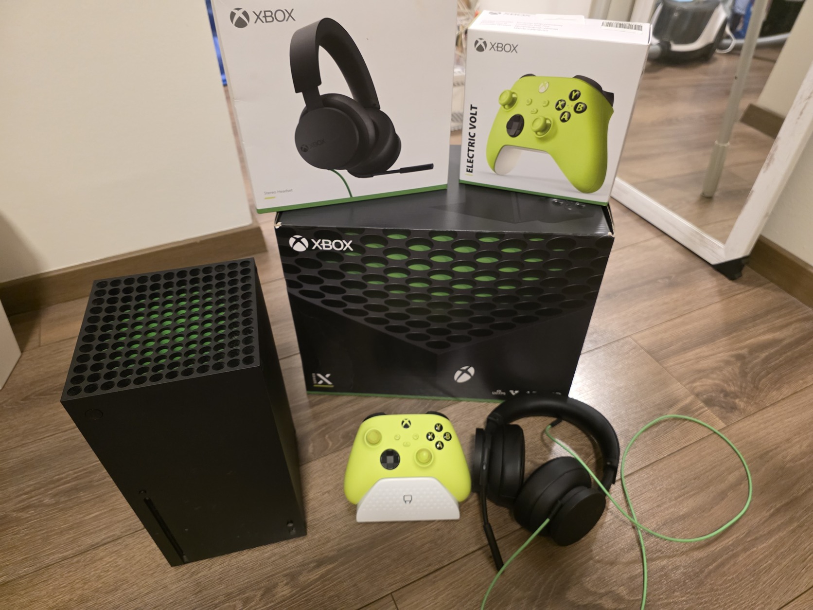 Eladó Xbox Series X. Garancia már nincs rá. Minden gyári tartozékával. Kontrollerbe akksi, hozzá töltőállomás. Vezetékes xboxos fejhallgató, párnáin minimális kopás látható.