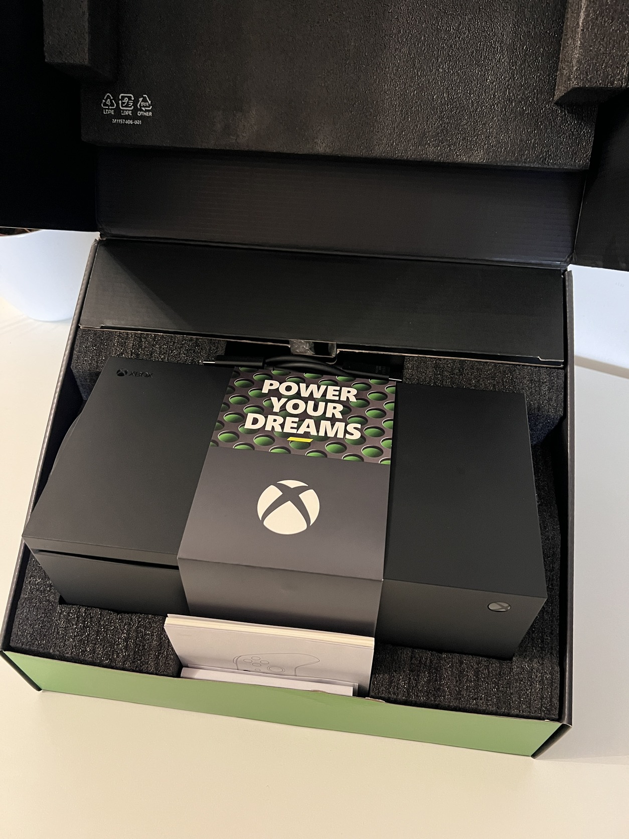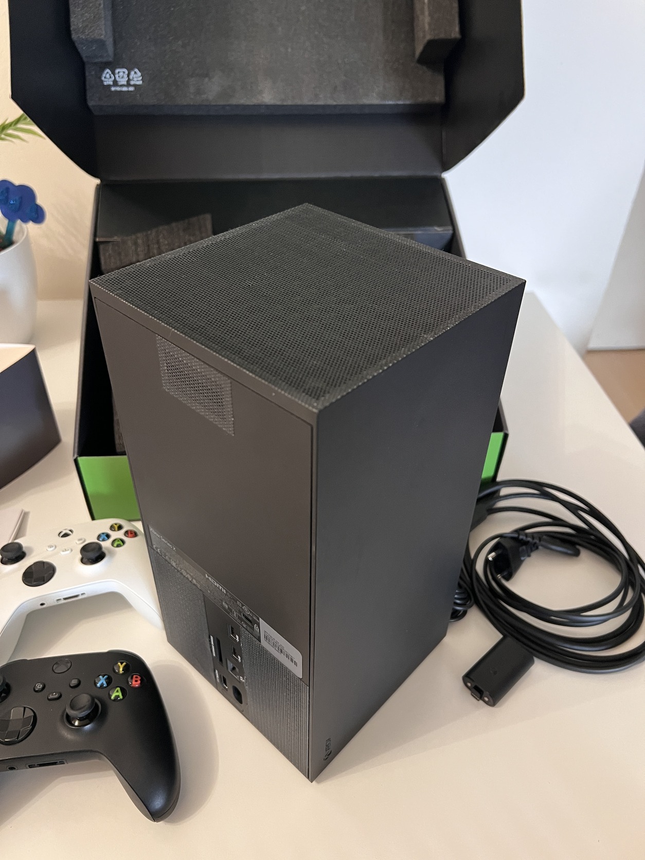 HDMI kábel, táp kábel, hozzá tartozó fekete kontroller. Az xboxra került egy porvédő rács képen láthatod.