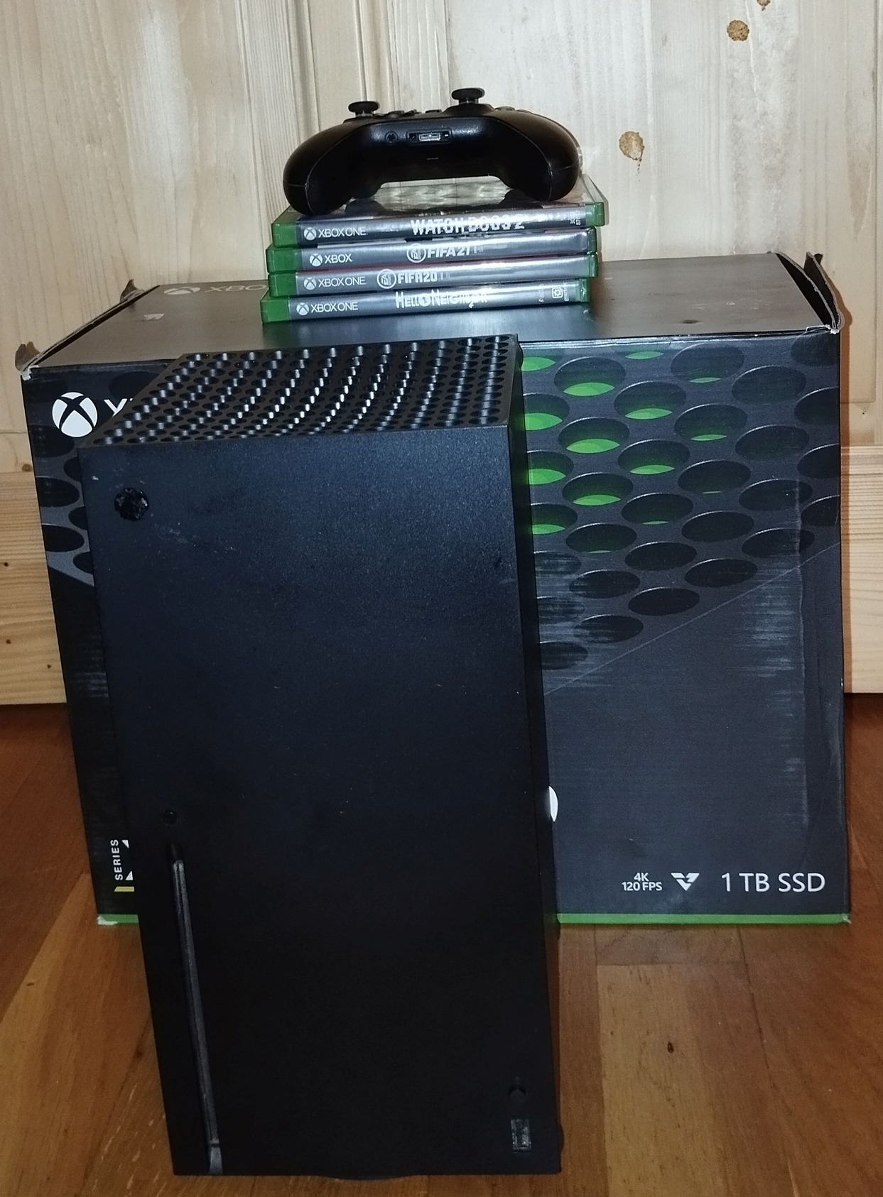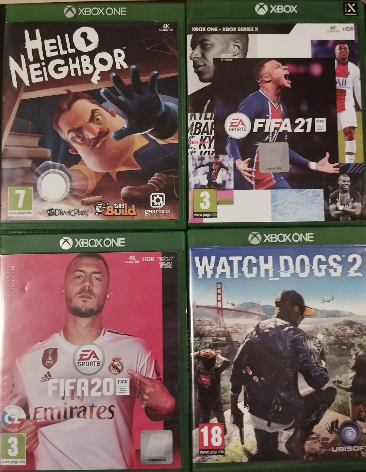 Gyári dobozában, hibátlanul működő kontrollerével, tápkábellel és HDMI kábellel, 4 db lemezes játékkal(FIFA20, FFIA21, Watch Dogs2 és Hello Neighbor).
