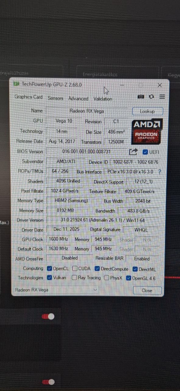 8GB HBM2 ram. (a driveren keresztül lehet plusz memóriát hozzá rakni. a rendszer memóriát fogja használni.)