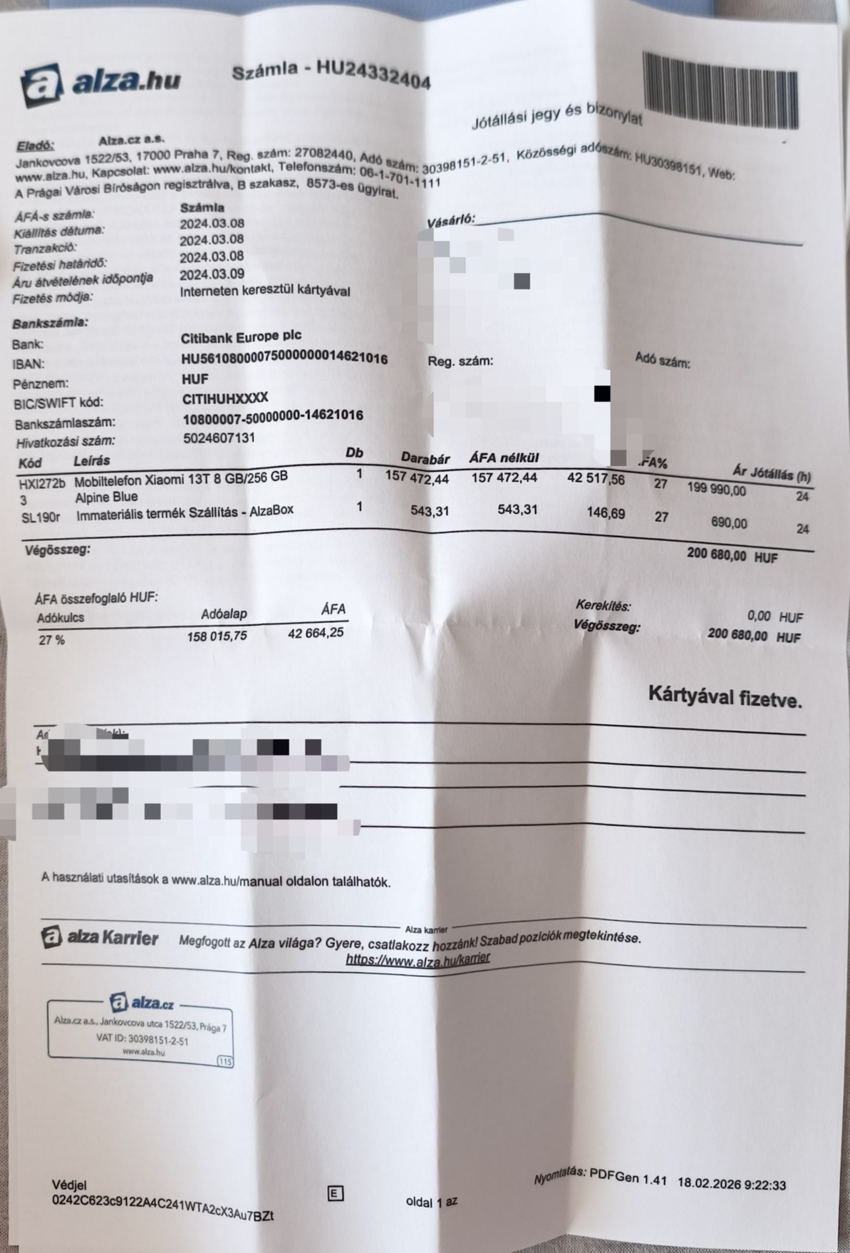 Eladó a képeken látható Xiaomi 13T 8G ram/ 256Mb Alza vásárlás még garanciális,minden tartozékával + van rajta üveg fólia,adok hozzá egy újszerű tokot. minden adat a garancia jegyről leolvasható.