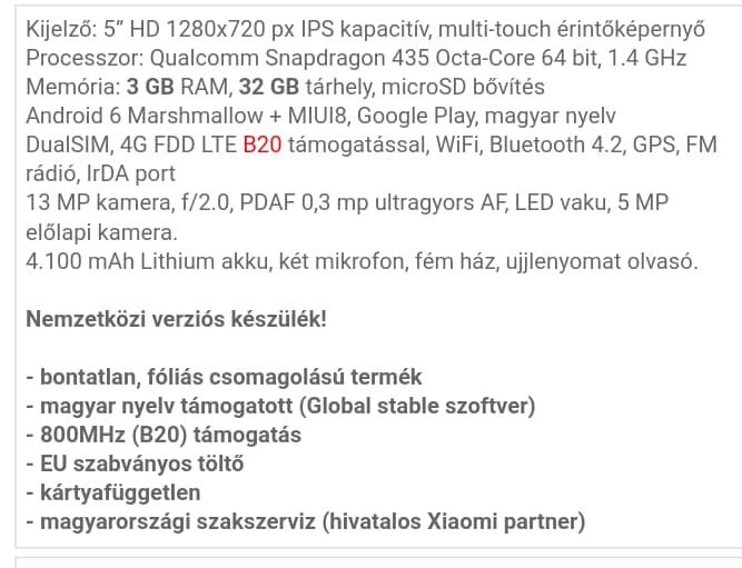 Amit tudni kell róla hogy fém házas , HD IPS kijelző, 1280*720 pixeles a felbontasa van benne 3 GB RAM , 32 GB a belső tarhelye, 8 magos processzor , előlapi kamera 5mpx, hátlapi pedig 13mpx , a legújabb miui felület van rajta , és a legfrissebb 7.1 es Android , ami automatikusan frissül ,van benne még infra is ami távirányítókent funkcionizal, kártya független, összes gyári tartozékával