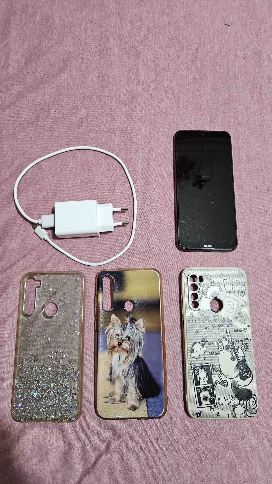 Telefon, töltőkábel, töltőfej, 3db tok.