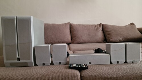 Yamaha Házimozi szett, korának megfelelő esztétikai állapotban, a hangfalak külső szövet borítása foltos, néhol pici szakadásokkal, de hibátlan műszaki állapotban, egyben eladó.