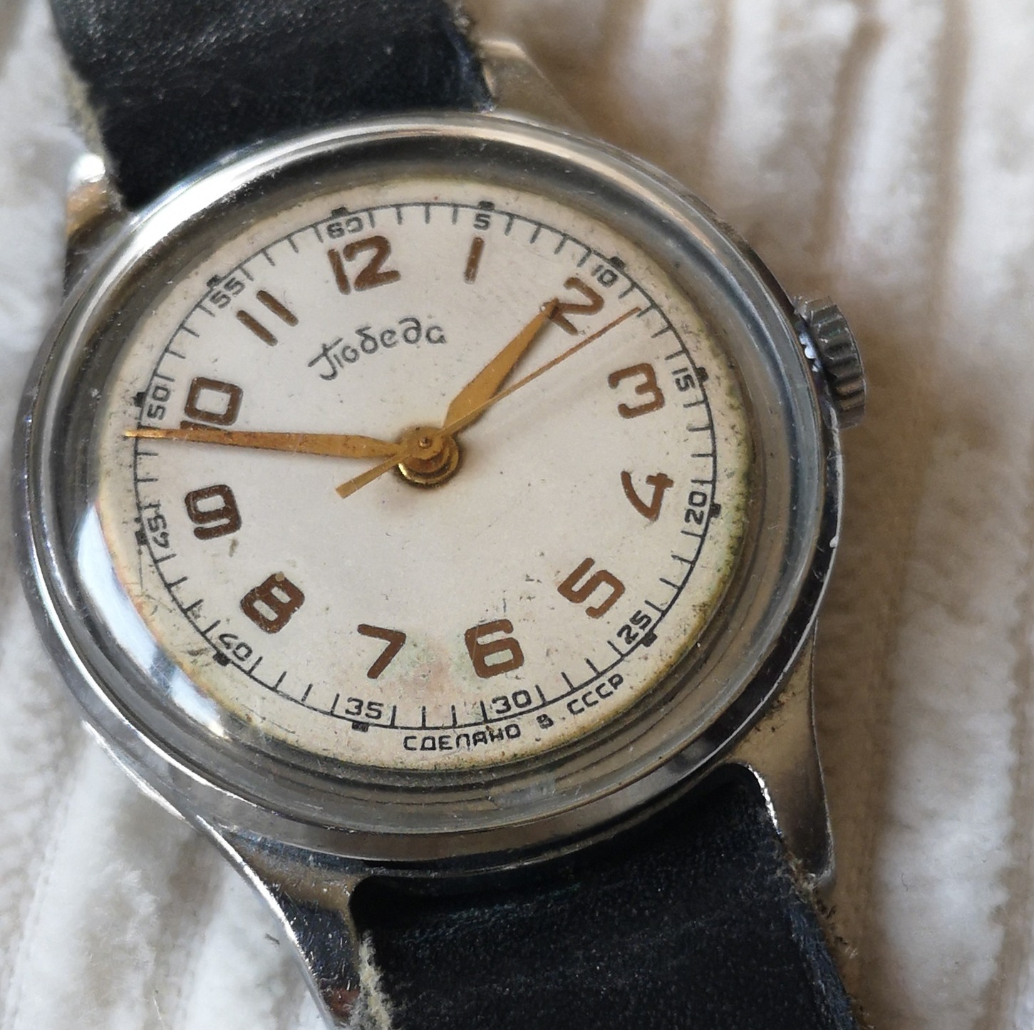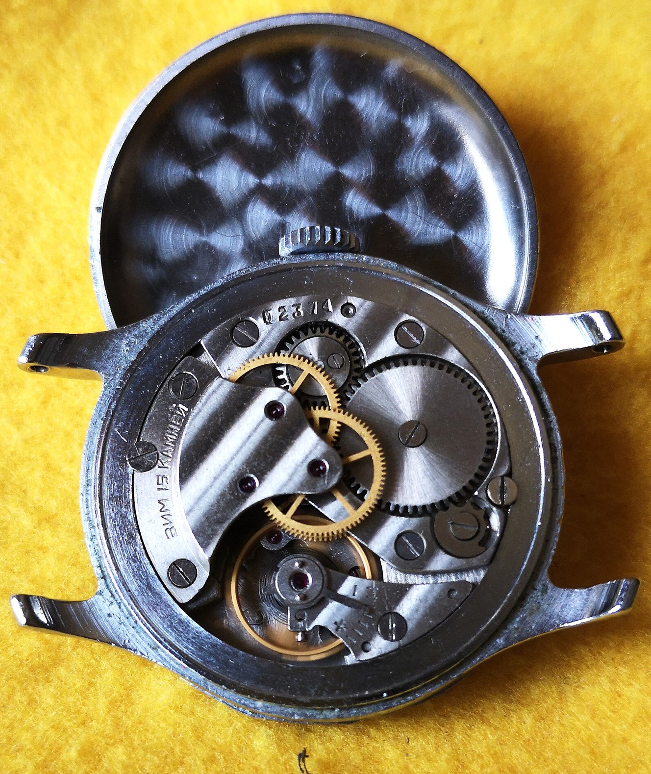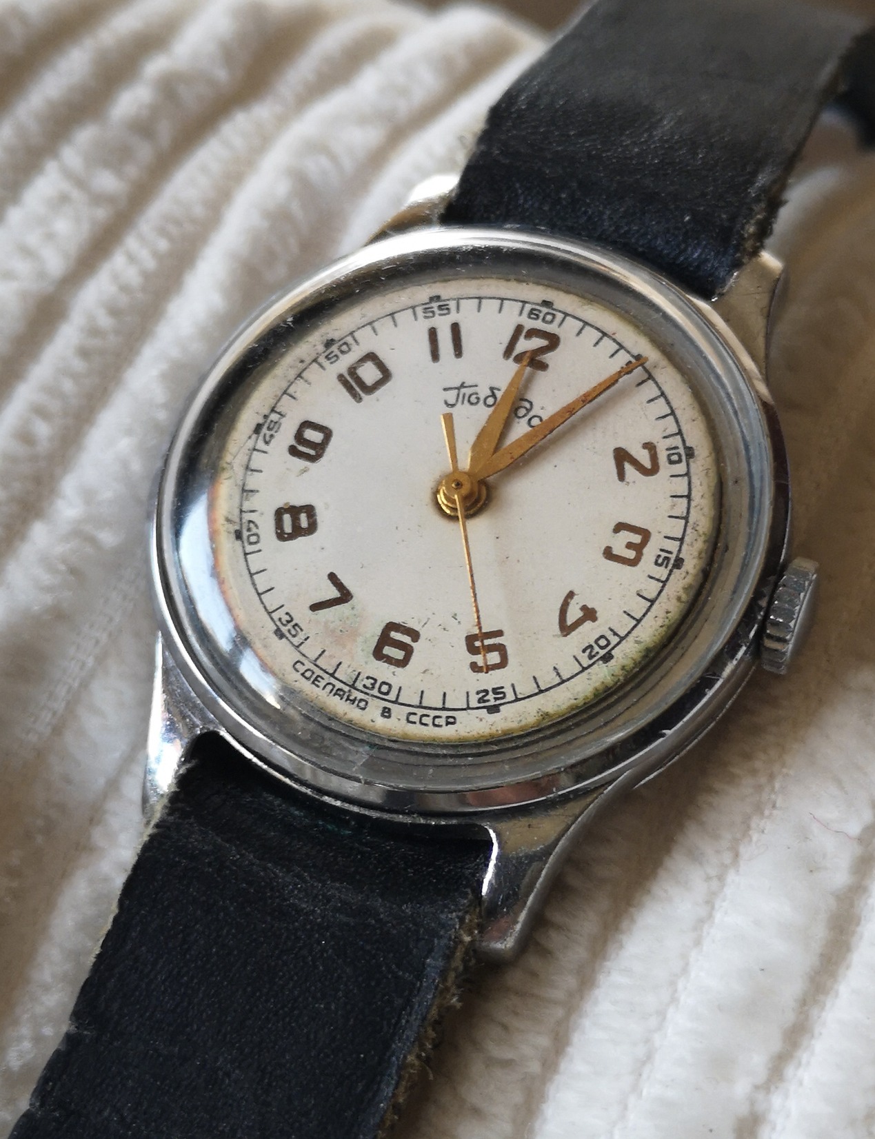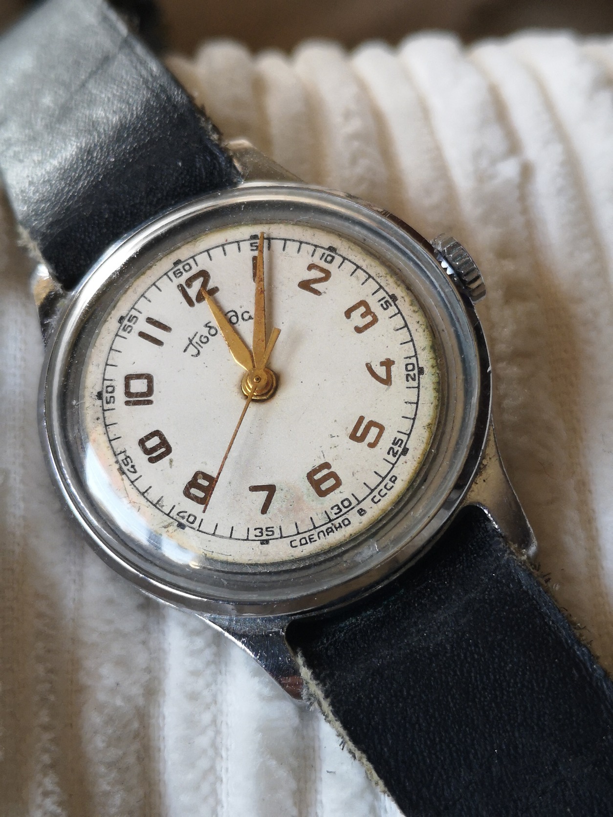 Maszlennyikovi ZIM-Pobeda az 50-es évekből; "Genfi-csíkos" , emelt-hidas, fémtiszta szerkezettel, makulátlan ciril-betűs számlap ; működik (Lásd, videó) , de